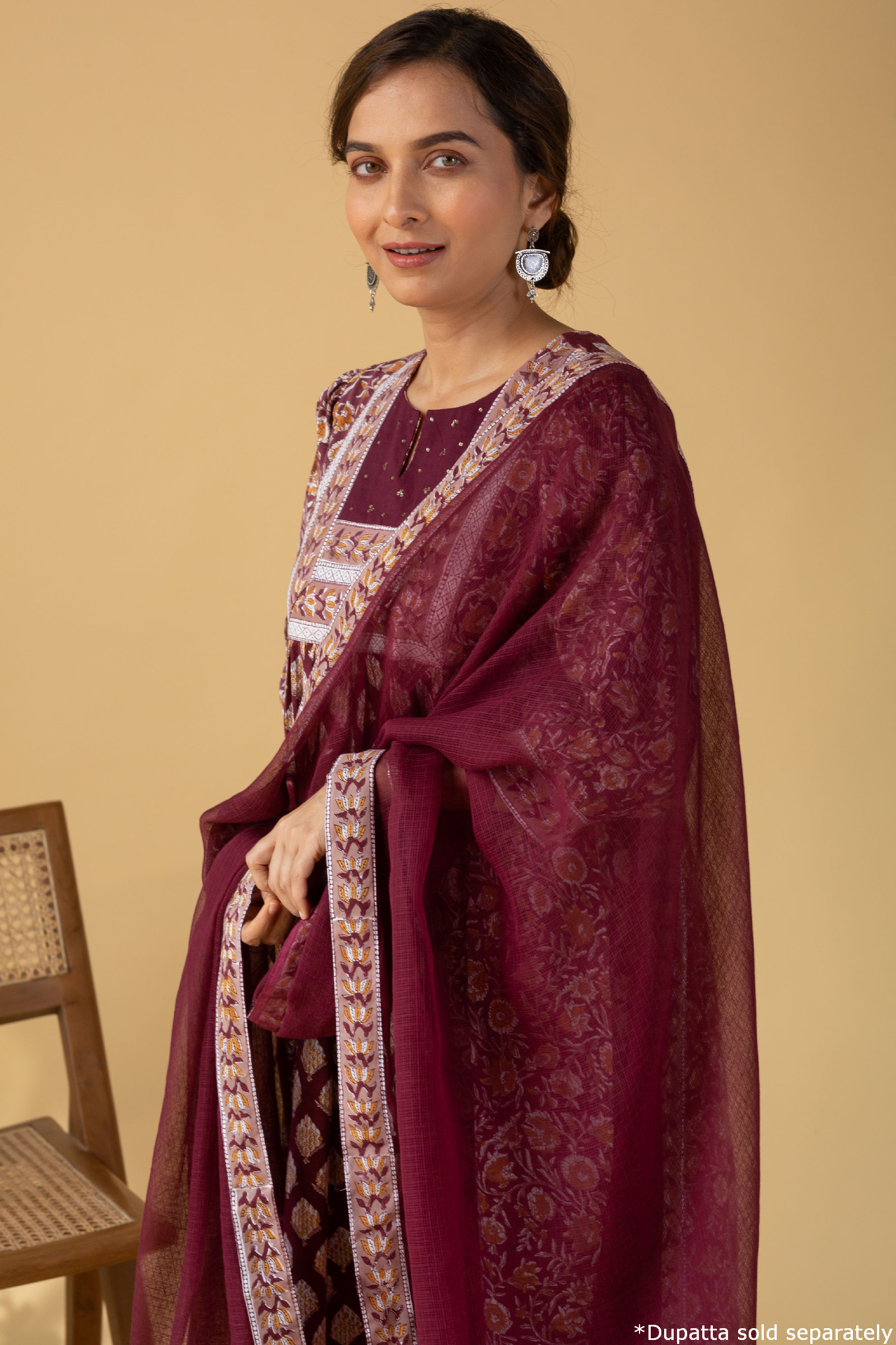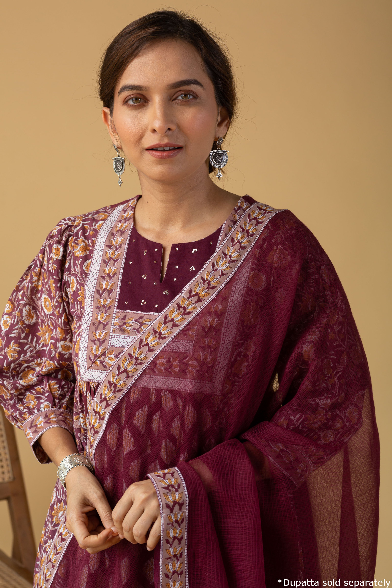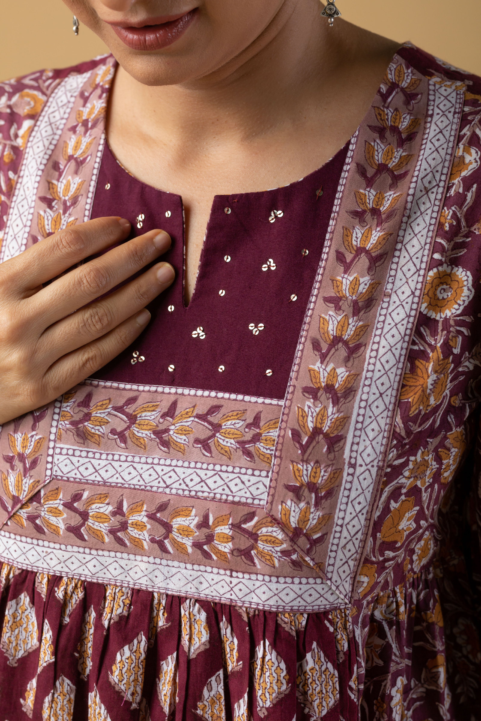 SKU: WKR195 This elegant cotton kurta features a rich wine base adorned with floral block prints in mustard and beige tones. The intricately printed square yoke is highlighted with subtle sequence work and a notched round neckline. Styled with gathered detailing under the yoke and 3/4th sleeves, it offers a flattering, flowy silhouette. It also includes one side pocket for added comfort and utility.