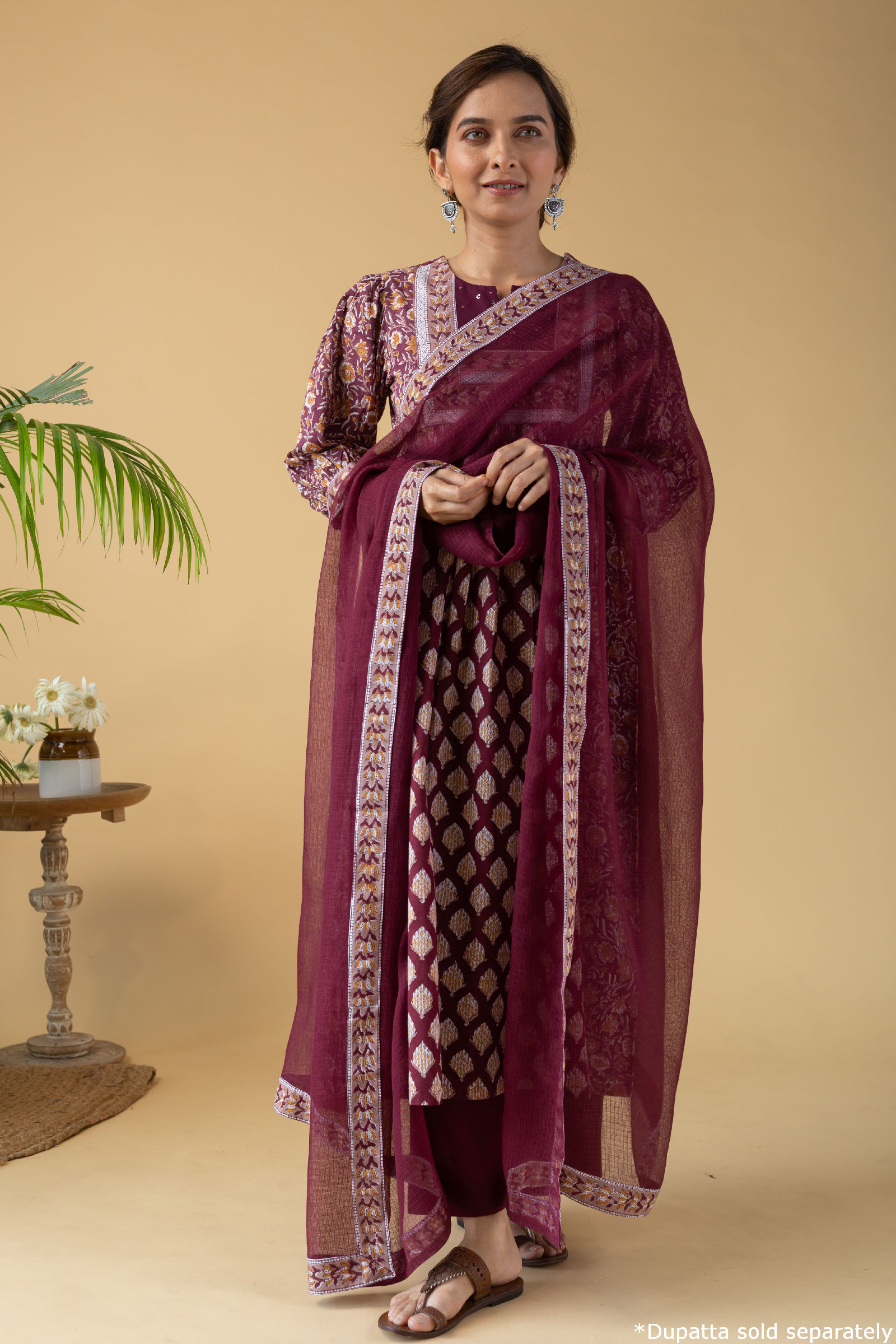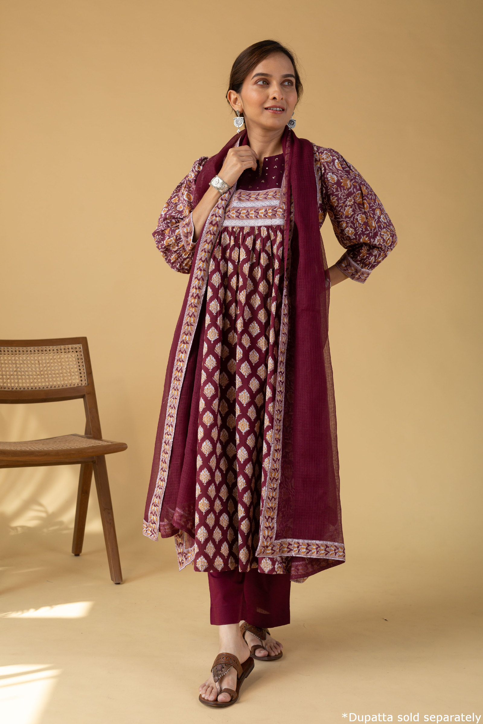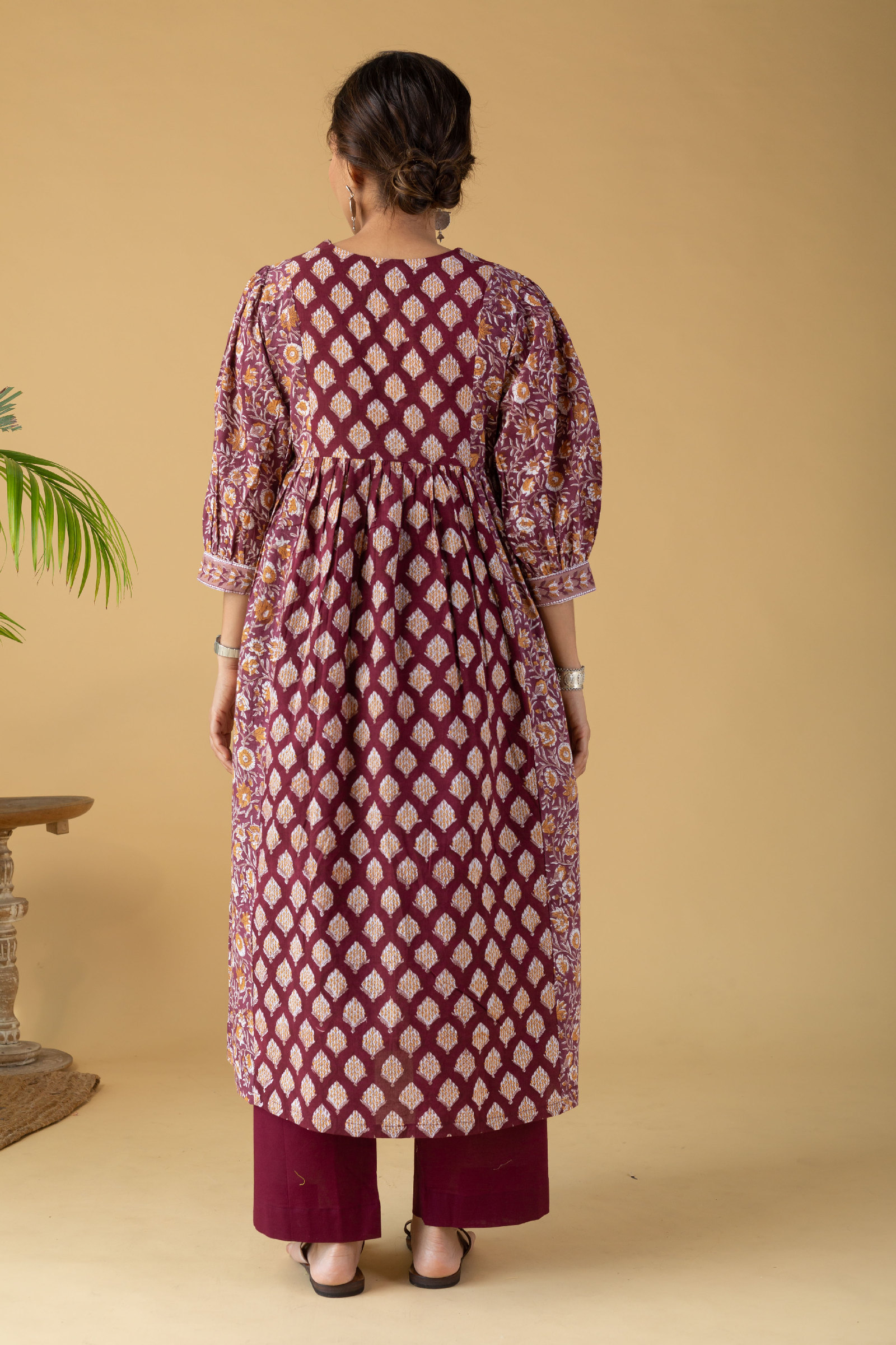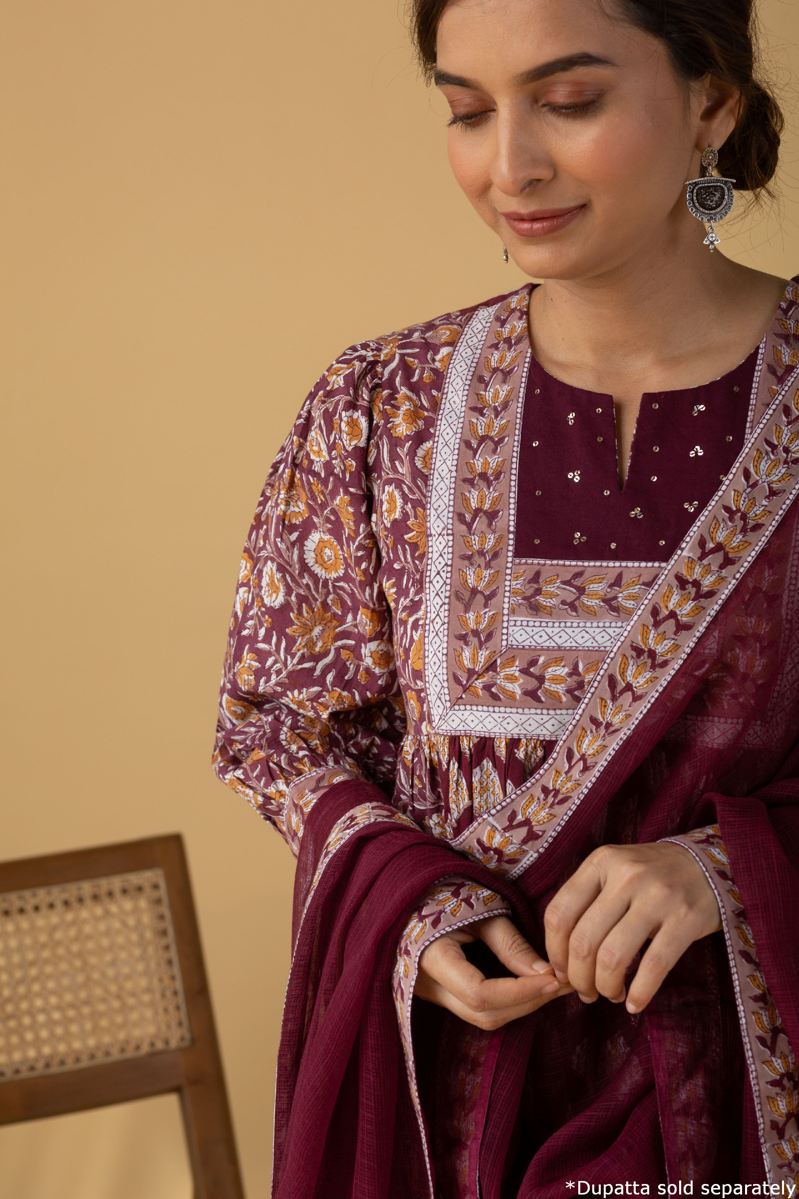 SKU: WKR195 This elegant cotton kurta features a rich wine base adorned with floral block prints in mustard and beige tones. The intricately printed square yoke is highlighted with subtle sequence work and a notched round neckline. Styled with gathered detailing under the yoke and 3/4th sleeves, it offers a flattering, flowy silhouette. It also includes one side pocket for added comfort and utility.