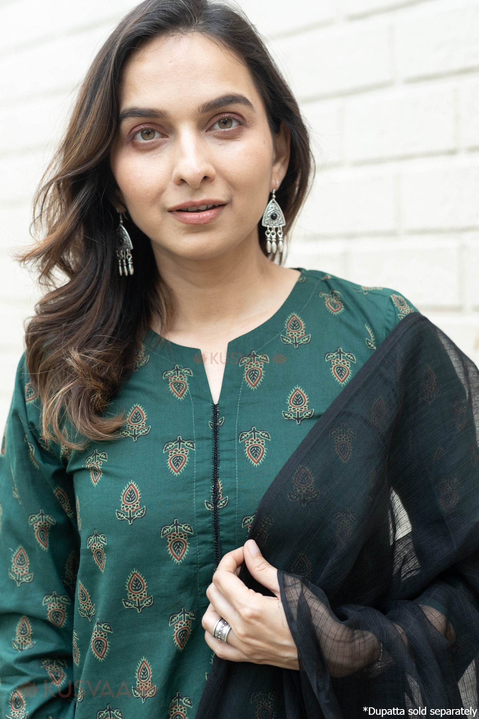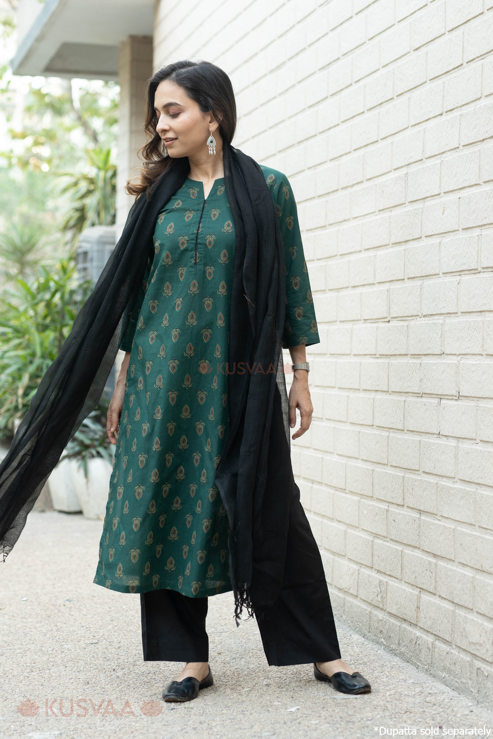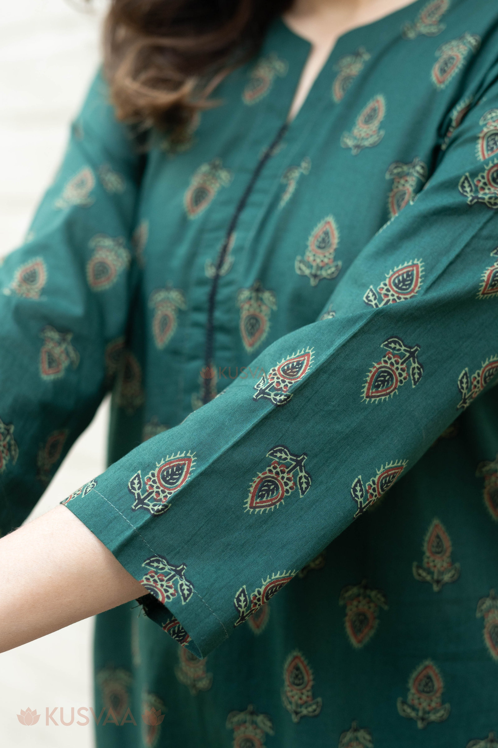 SKU: WKR302 Exude understated grace in this deep bottle green cotton kurta, beautifully adorned with an earthy leafy screen print throughout the fabric. This straight-style silhouette features a sophisticated Mandarin collar with a delicate V-notch and slender three-quarter sleeves, accented by a subtle black piped trim along the neckline for a refined finish. Tailored for all-day comfort, the breathable cotton fabric is paired with a practical one-side pocket, making it a versatile choice for both professional and casual outings.