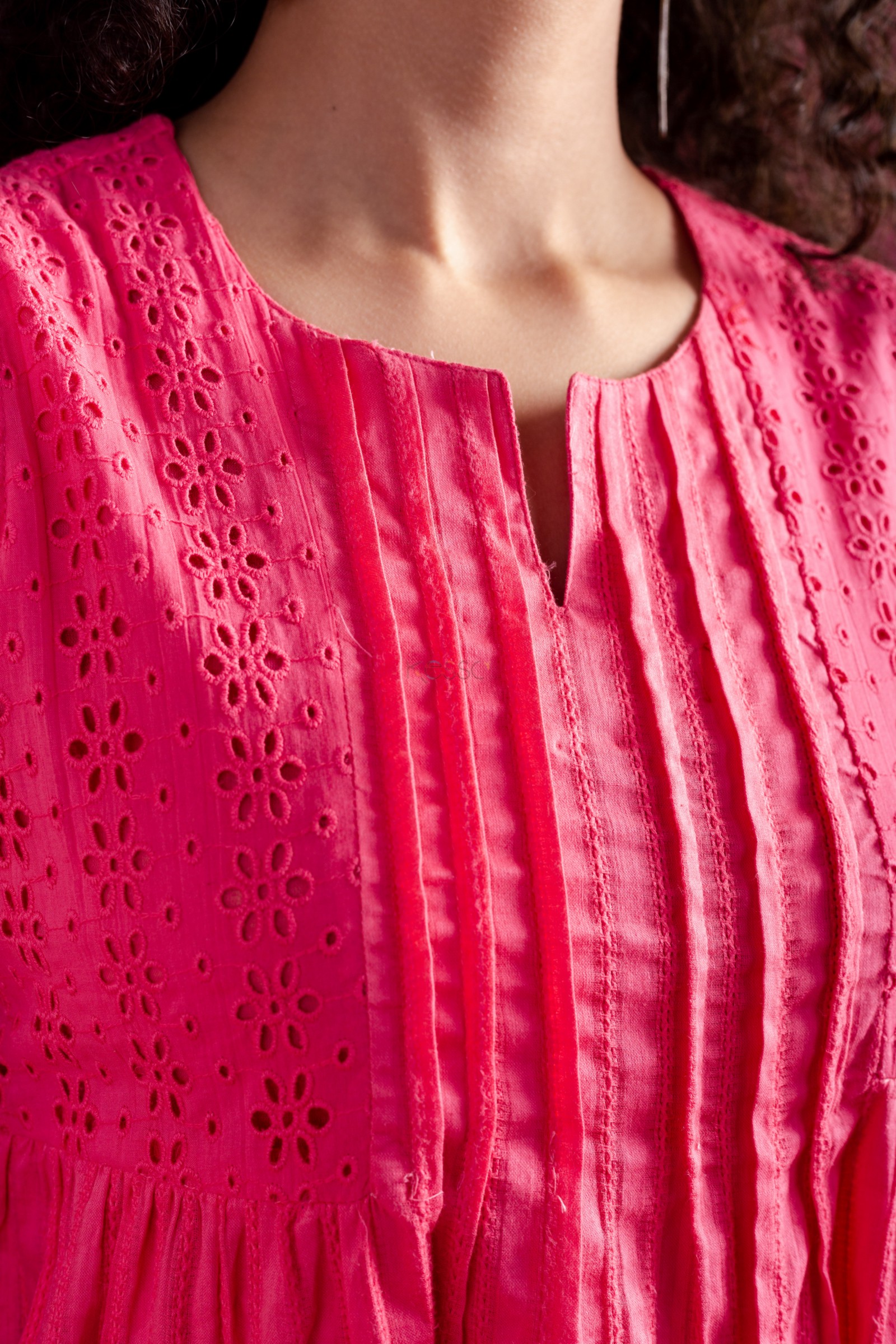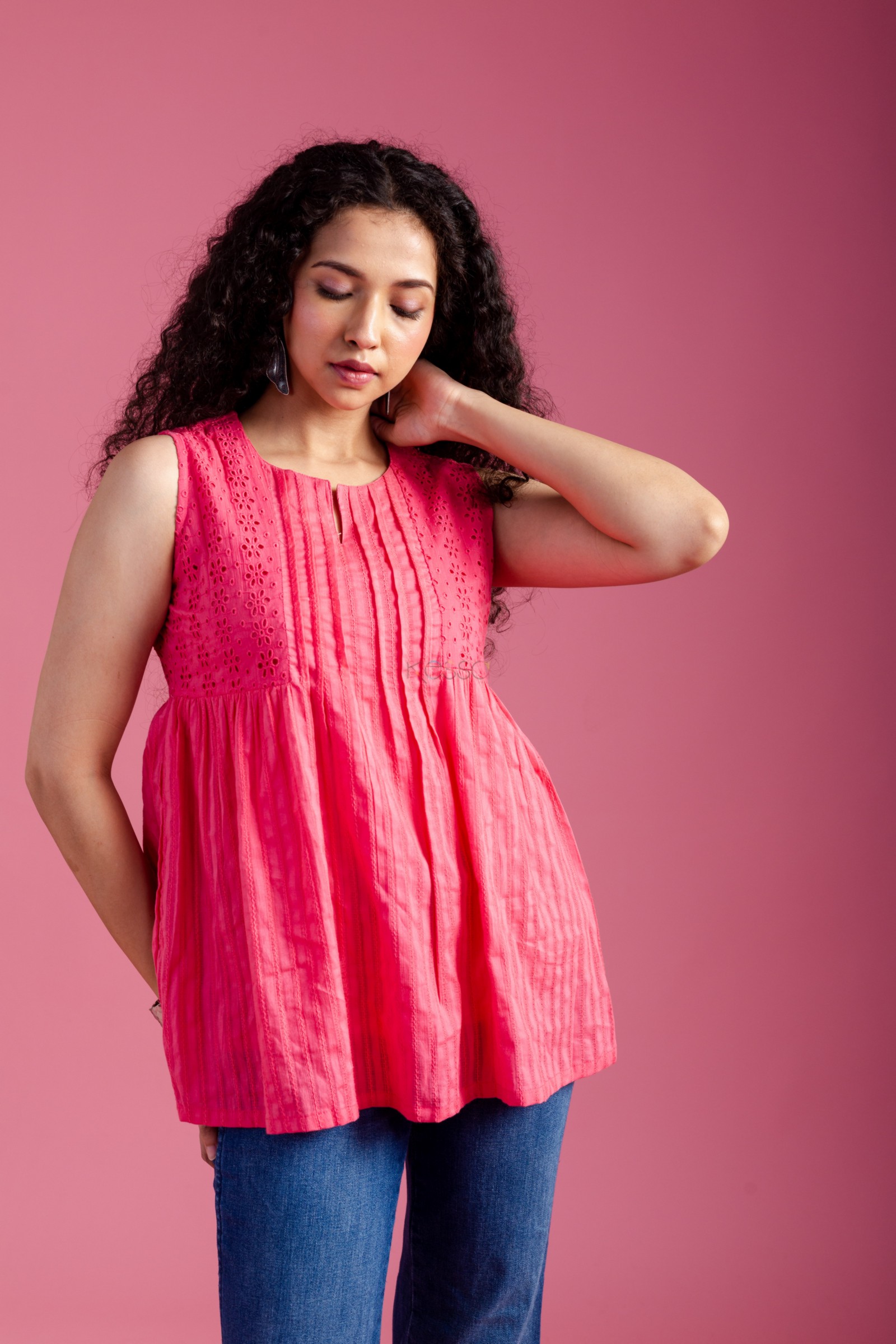 SKU: WS1023 This stylish cotton dobby short top in a beautiful pink hue is the epitome of chic. The top features an eye-catching Printex design combined with intricate shiffly work, adding a touch of elegance to its playful appeal. With a flattering round neck and a v-cut detail, this sleeveless top is perfect for any fashion-forward summer look.