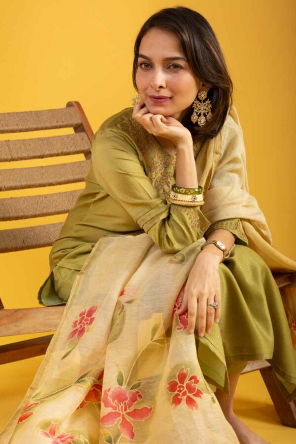 SKU: WS1065 This Chanderi Complete Suit Set in a delightful mehendi green shade offers a timeless straight-fit silhouette. The kurta is adorned with intricate embroidery on the neckline and enchanting embroidery with printex detailing on the sleeves, adding a touch of elegance to the ensemble. The kurta is lined with soft cotton for comfort, while the printed dupatta complements the set beautifully. The pants feature stylish biziya work and practical side pockets, and the ensemble is completed with a round V-cut neck and 3/4th sleeves, making it a perfect choice for any occasion.