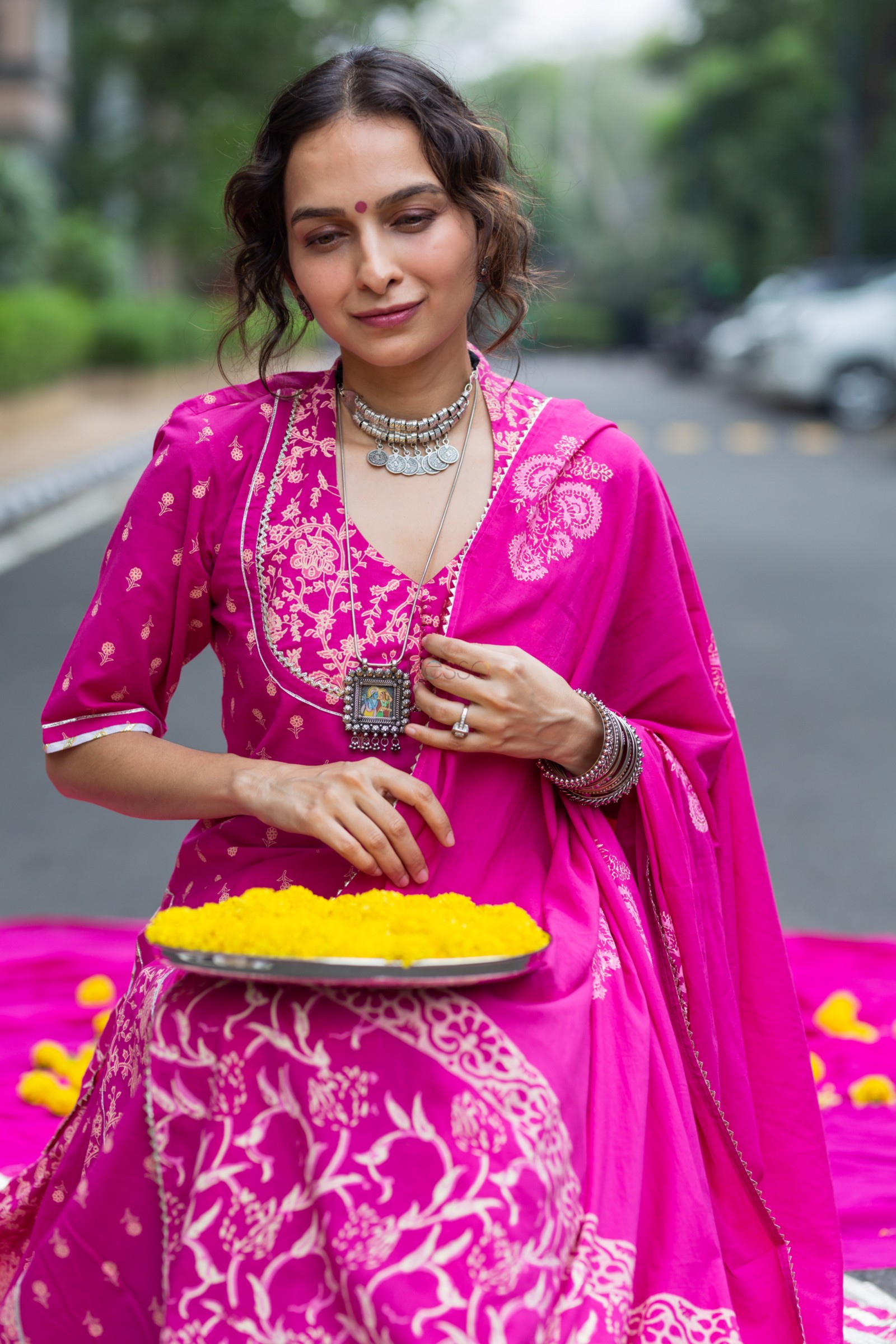 SKU: WS1073 This magenta pink cotton complete skirt set is a stunning choice for traditional events. The khadi print adds a touch of sophistication to the outfit, while the top features a yoke highlighted with bijiya, gota, and potli buttons for a rich look. The sleeves are adorned with gota and piping, and the skirt is beautifully highlighted with gota and khadi print, complete with handmade tassels. The accompanying dupatta is a perfect match, featuring all-over gota and khadi print, and the ensemble is completed with a V-neck and elbow sleeves. Ideal for a traditional and festive appearance.