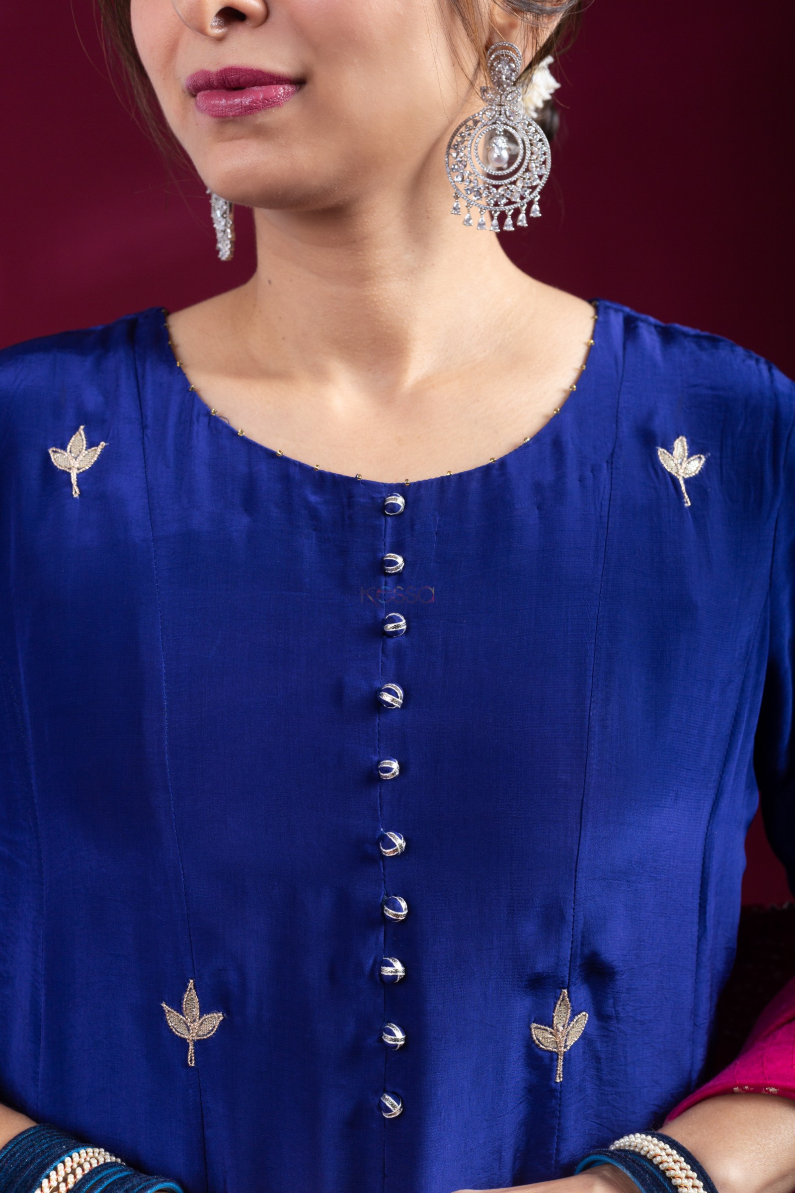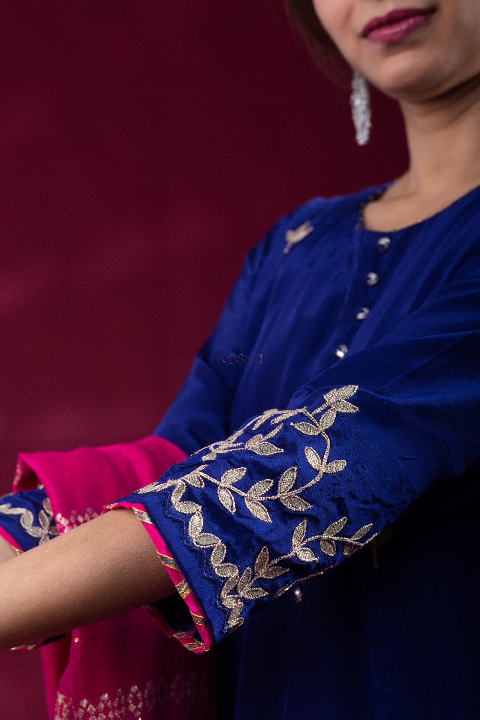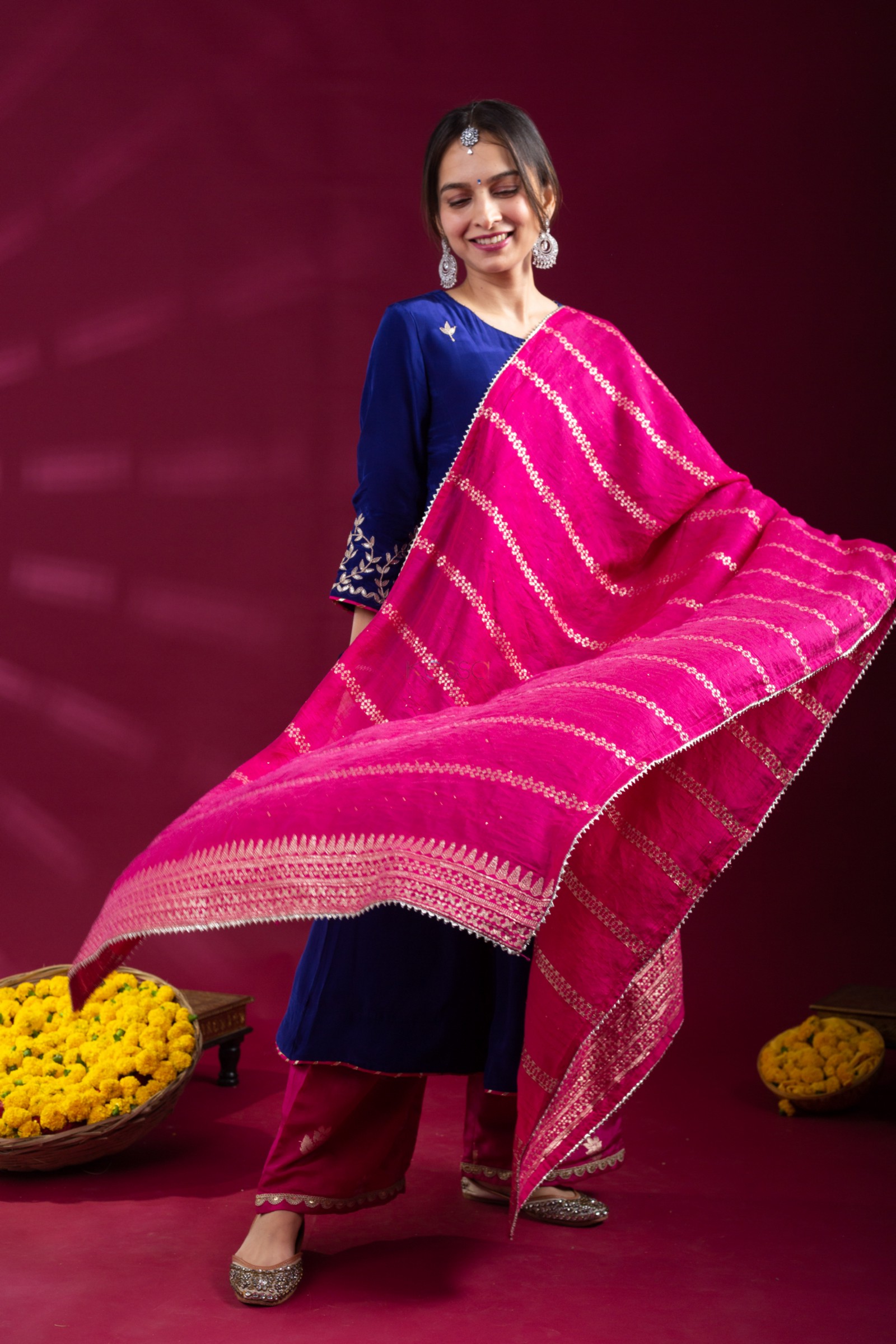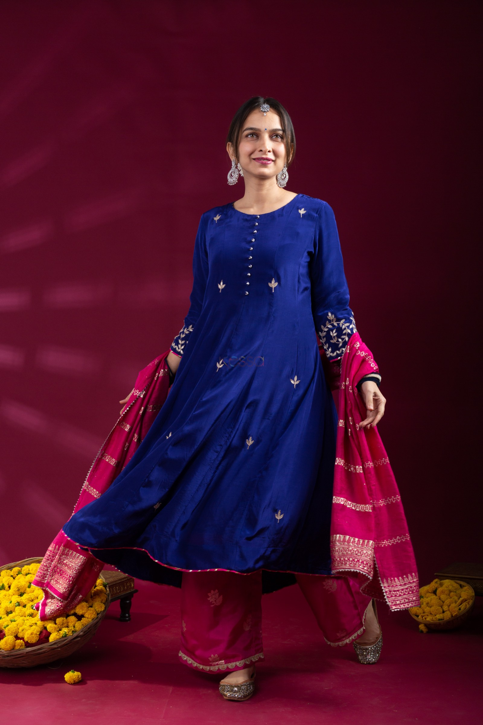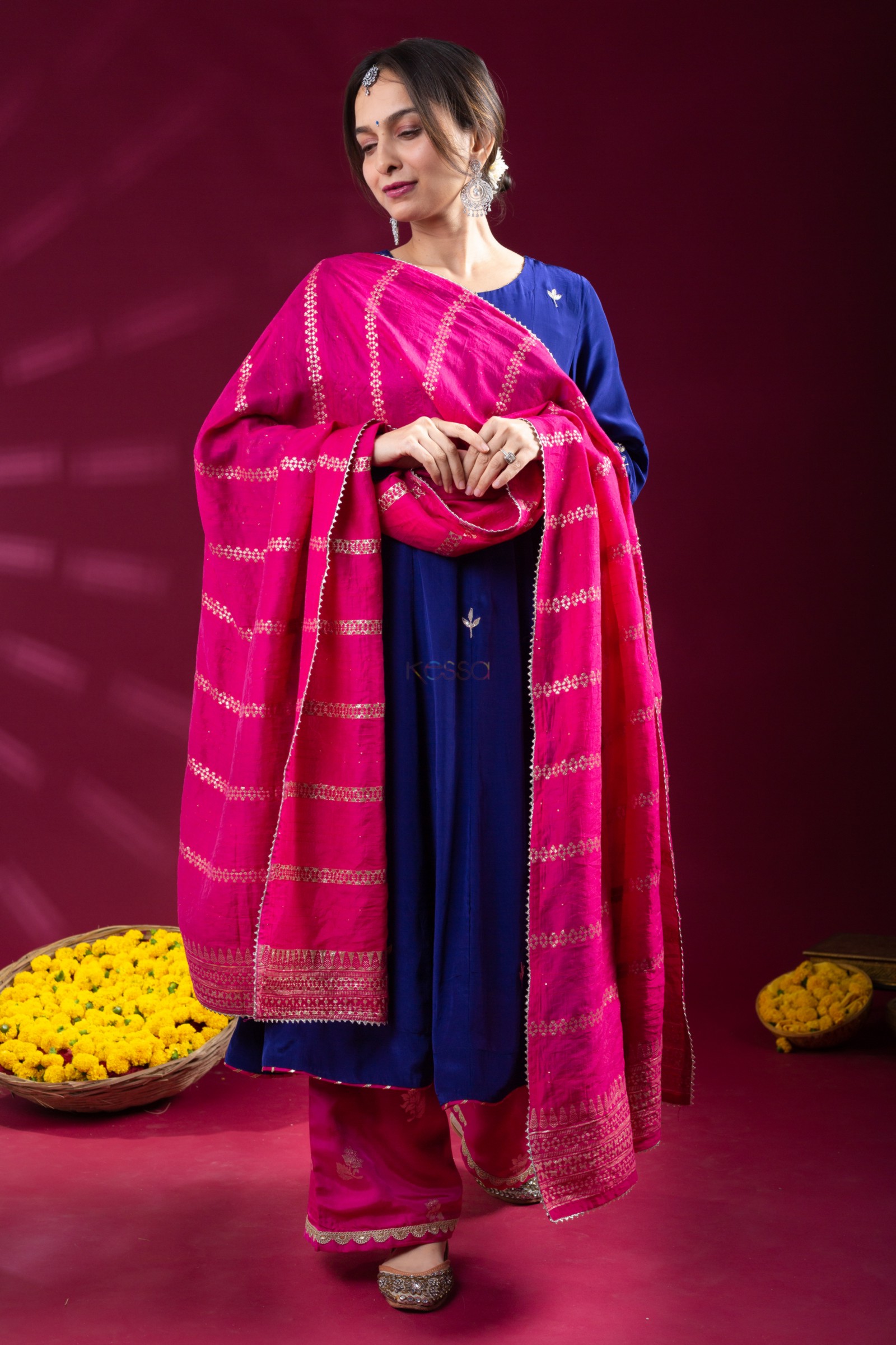 SKU: WS1078 Elevate your ethnic wardrobe with this exquisite women’s complete suit set. The set features a stylish A-line kurta in a rich blue color, adorned with intricate zari booti work and gota patti detailing all over. The neckline is highlighted with delicate handmade buttons, while the sleeves and panels feature elegant magzi work. The majenta pink plazo is beautifully complemented with gota lace, creating a stunning contrast. To complete the ensemble, the chanderi dupatta is also adorned with intricate gota lace, making this suit set a perfect choice for special occasions with its round neck and 3/4th sleeves.