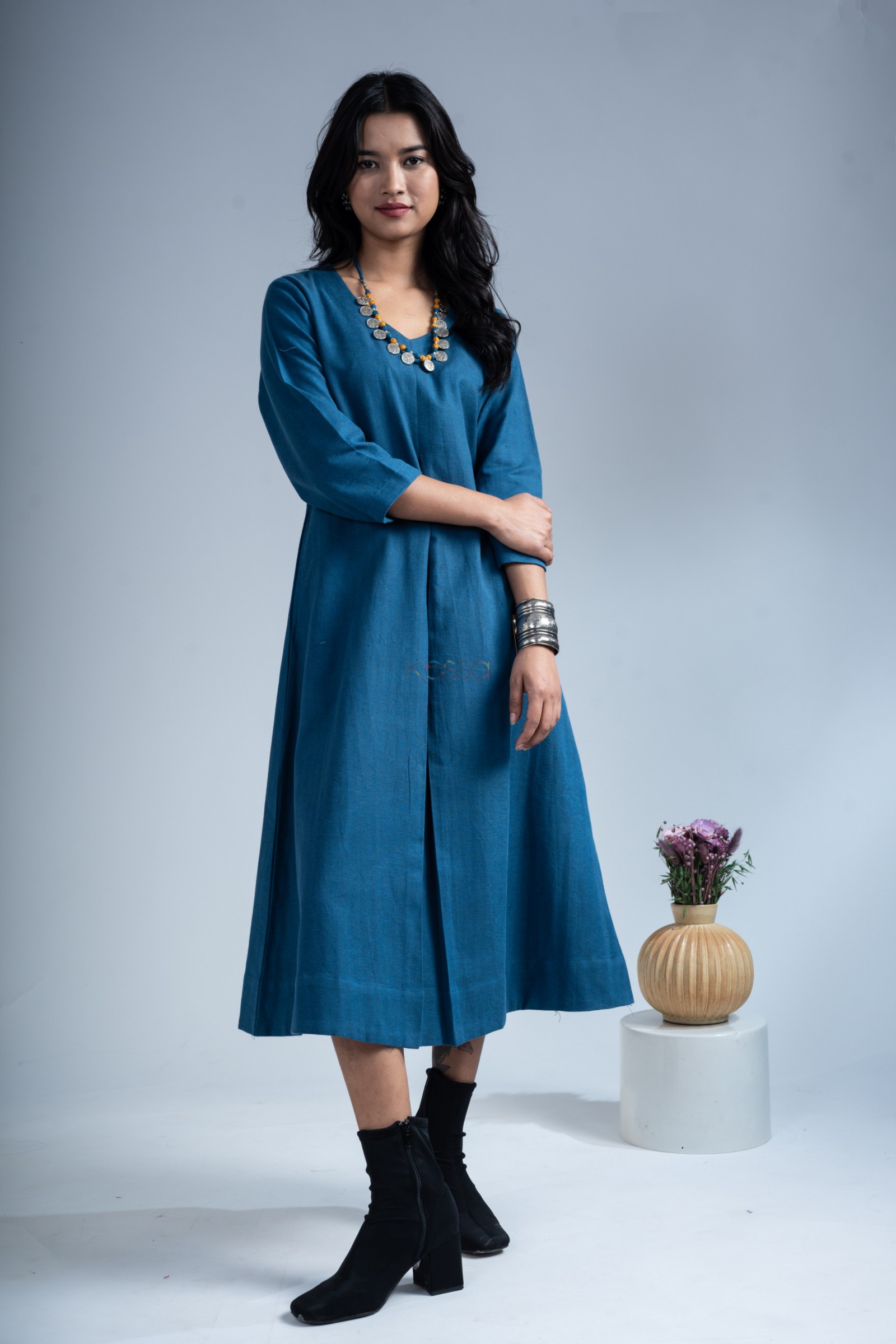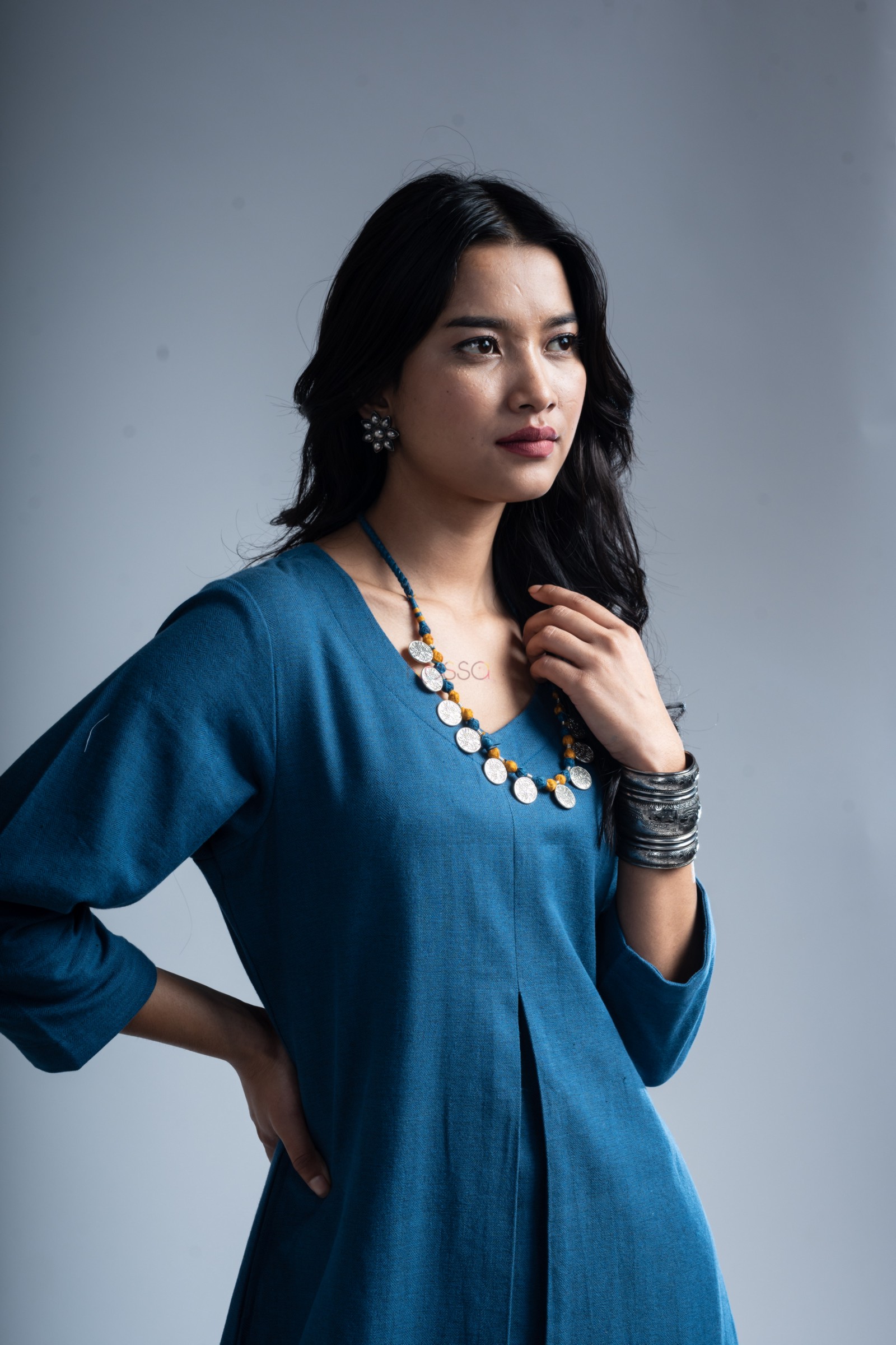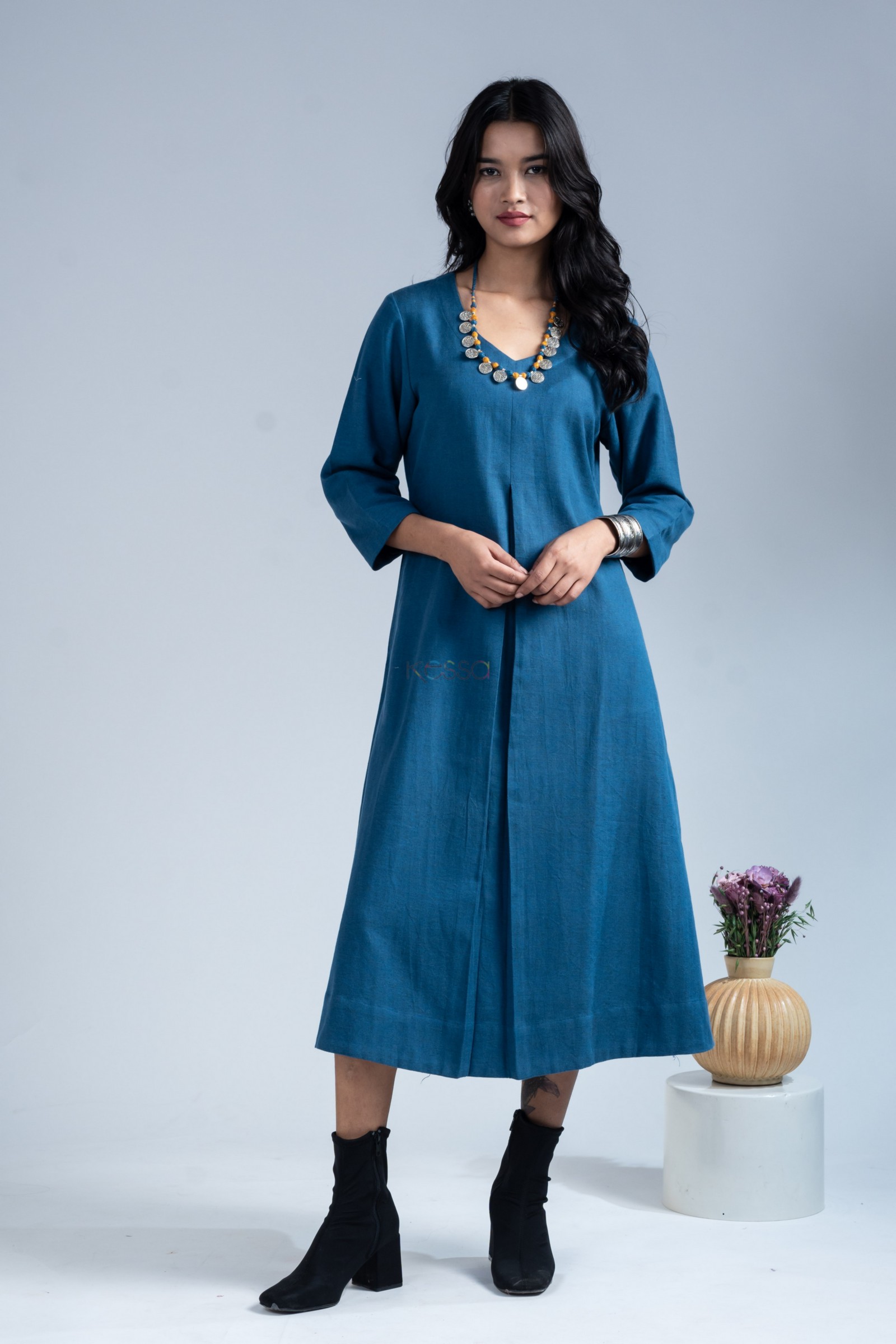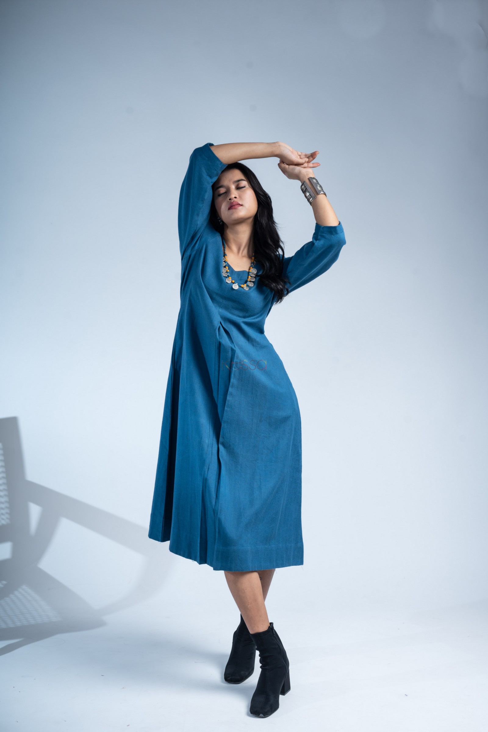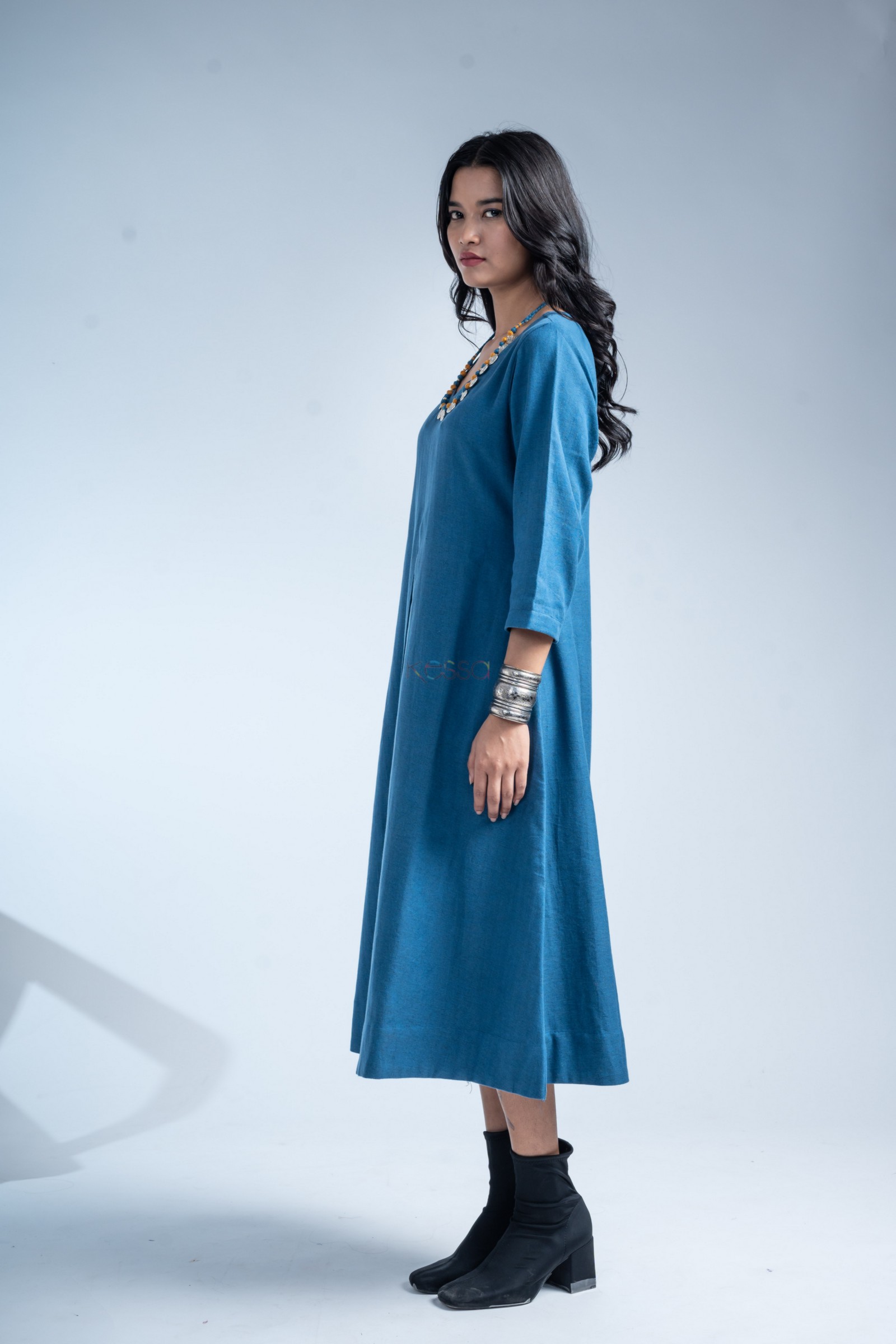 SKU: WS1085 Elevate your style with our indigo Woolen dress, featuring a chic A-line silhouette that exudes grace. The V-neck and 3/4th sleeves add a touch of sophistication, while the dual side pockets enhance functionality. This ensemble is uniquely adorned with a matching attached necklace, making it a seamless blend of elegance and convenience for a distinctive and complete look.