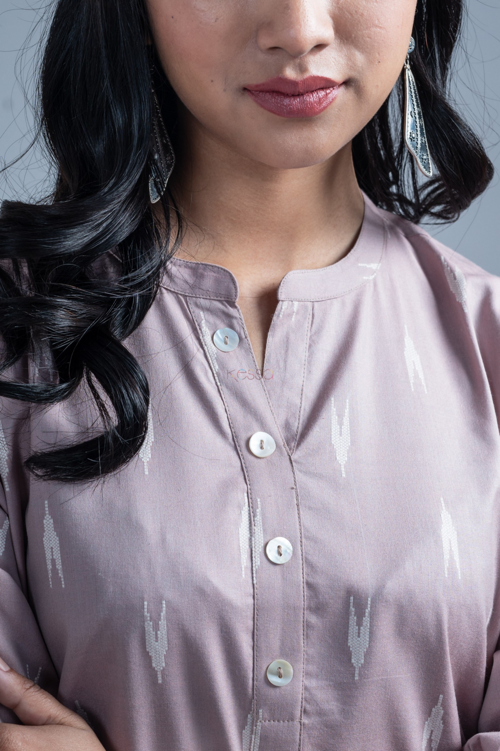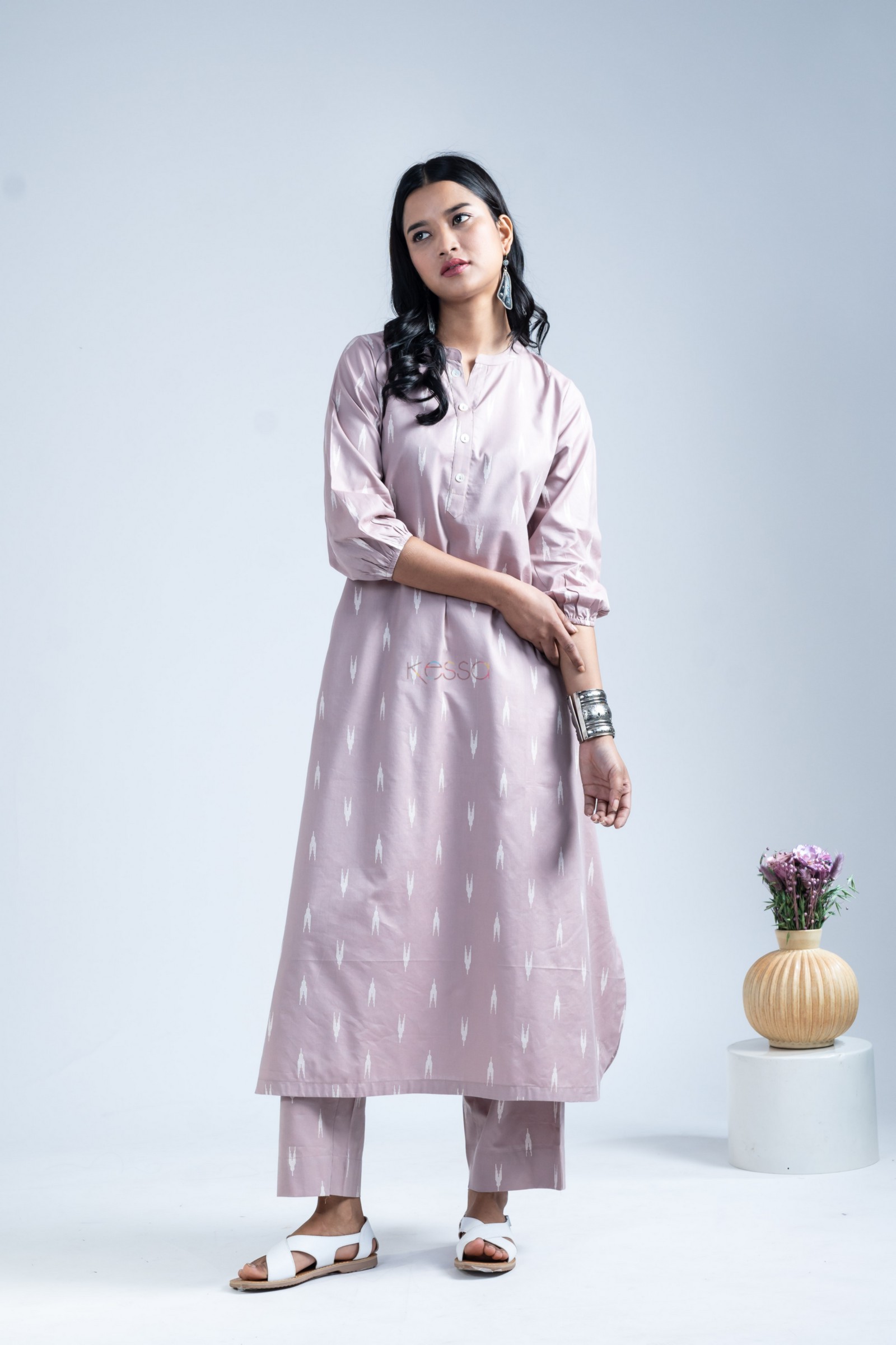 SKU: WS1090 Elevate your wardrobe with this enchanting onion pink kurta pant set crafted from breathable South cotton. The kurta boasts a stylish yoke highlighted with delicate shell buttons, along with a chic color neck and 3/4th sleeves for a graceful look. The accompanying pant features a front dori and back elastic for a comfortable and fashionable fit, making this ensemble a perfect blend of comfort and elegance.