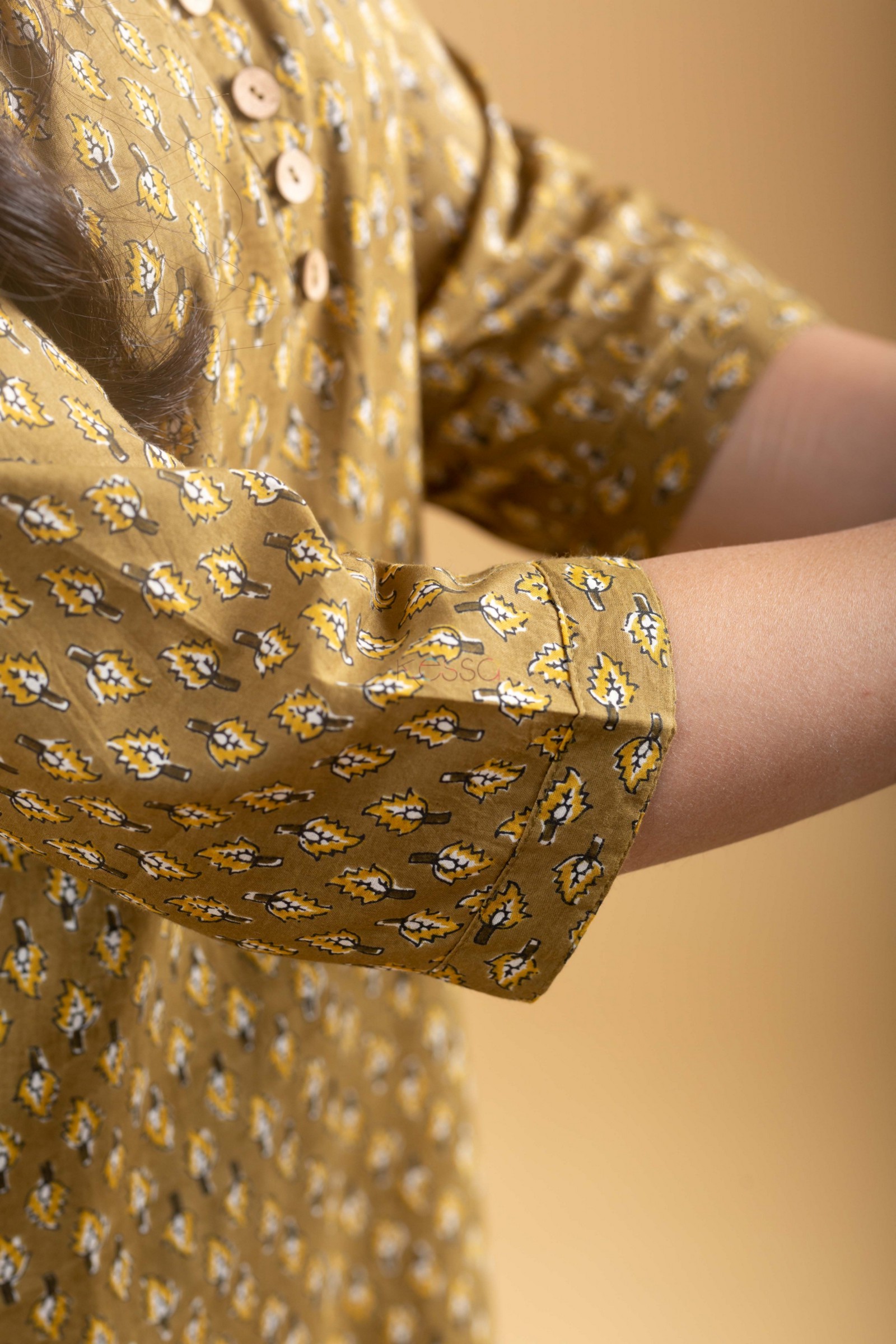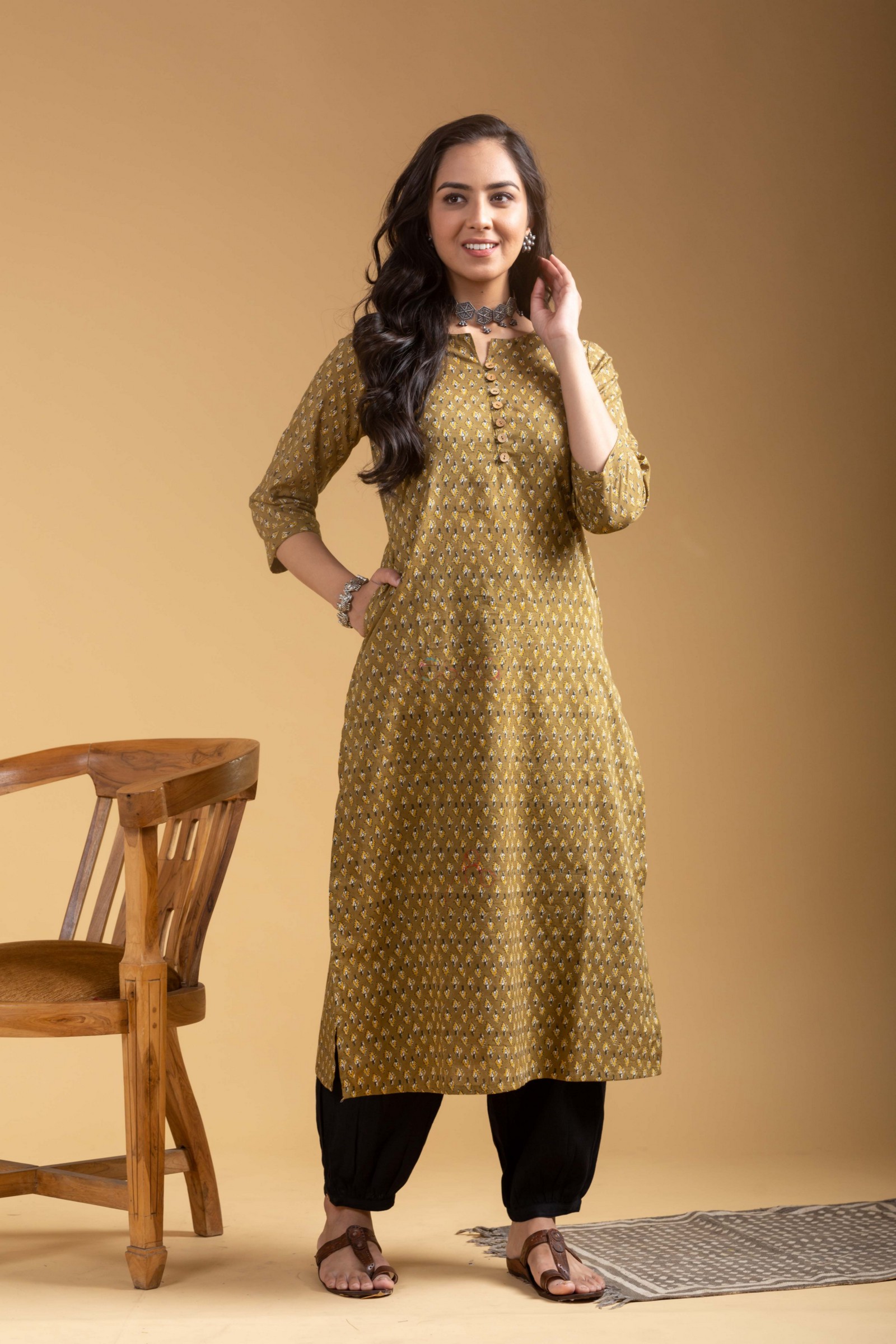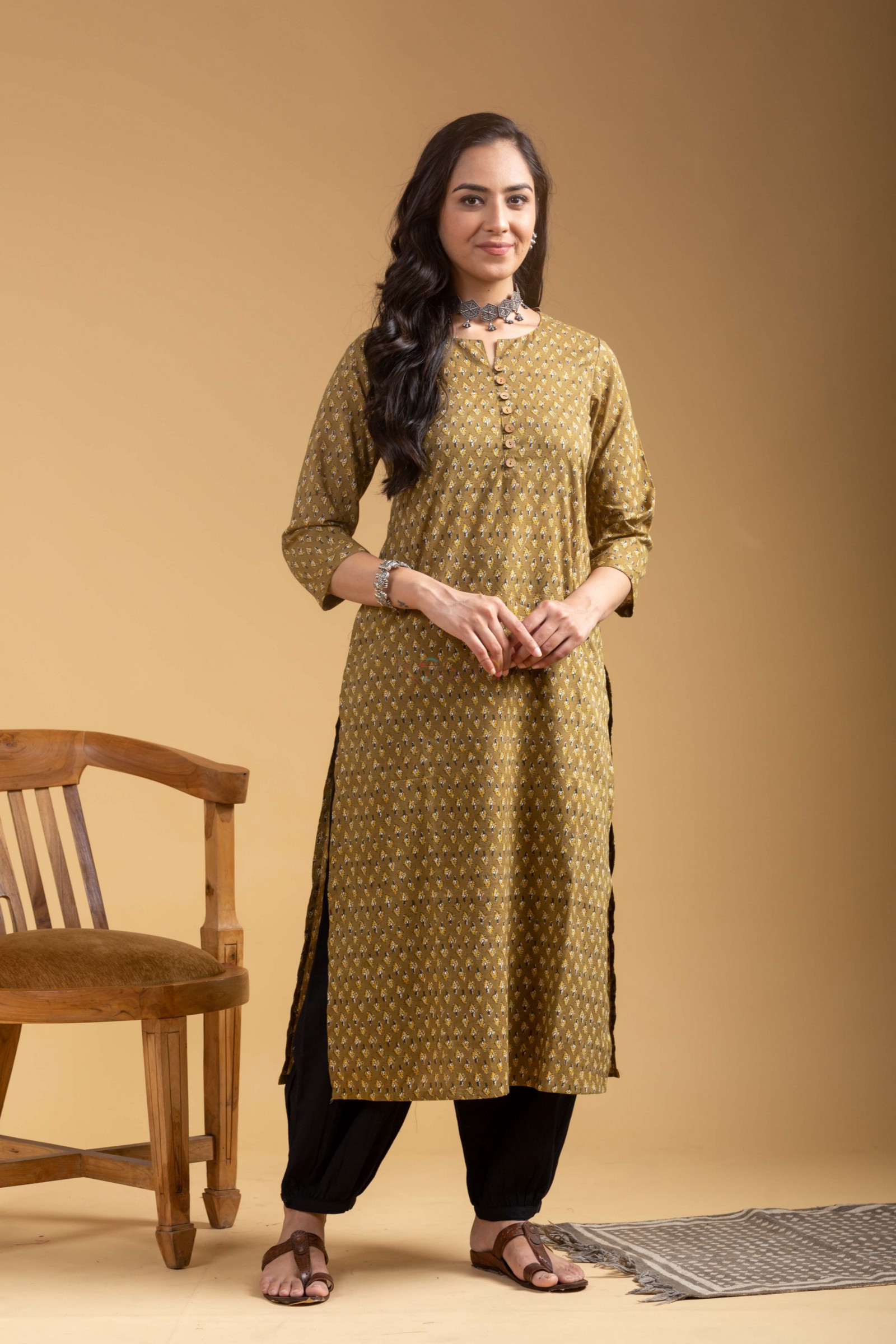SKU: WS1095 In a soothing mehendi green hue, this cotton kurta embraces a classic straight fit adorned with intricate booti prints, exuding timeless elegance. The yoke, accentuated with charming wooden buttons, adds a rustic touch to the round neck with a subtle V-cut, while the convenience of a side pocket enhances its practicality. With 3/4th sleeves offering comfort and style, this kurta effortlessly blends tradition with contemporary flair.Pair it with our cotton salwar for a cohesive look that exudes confidence.