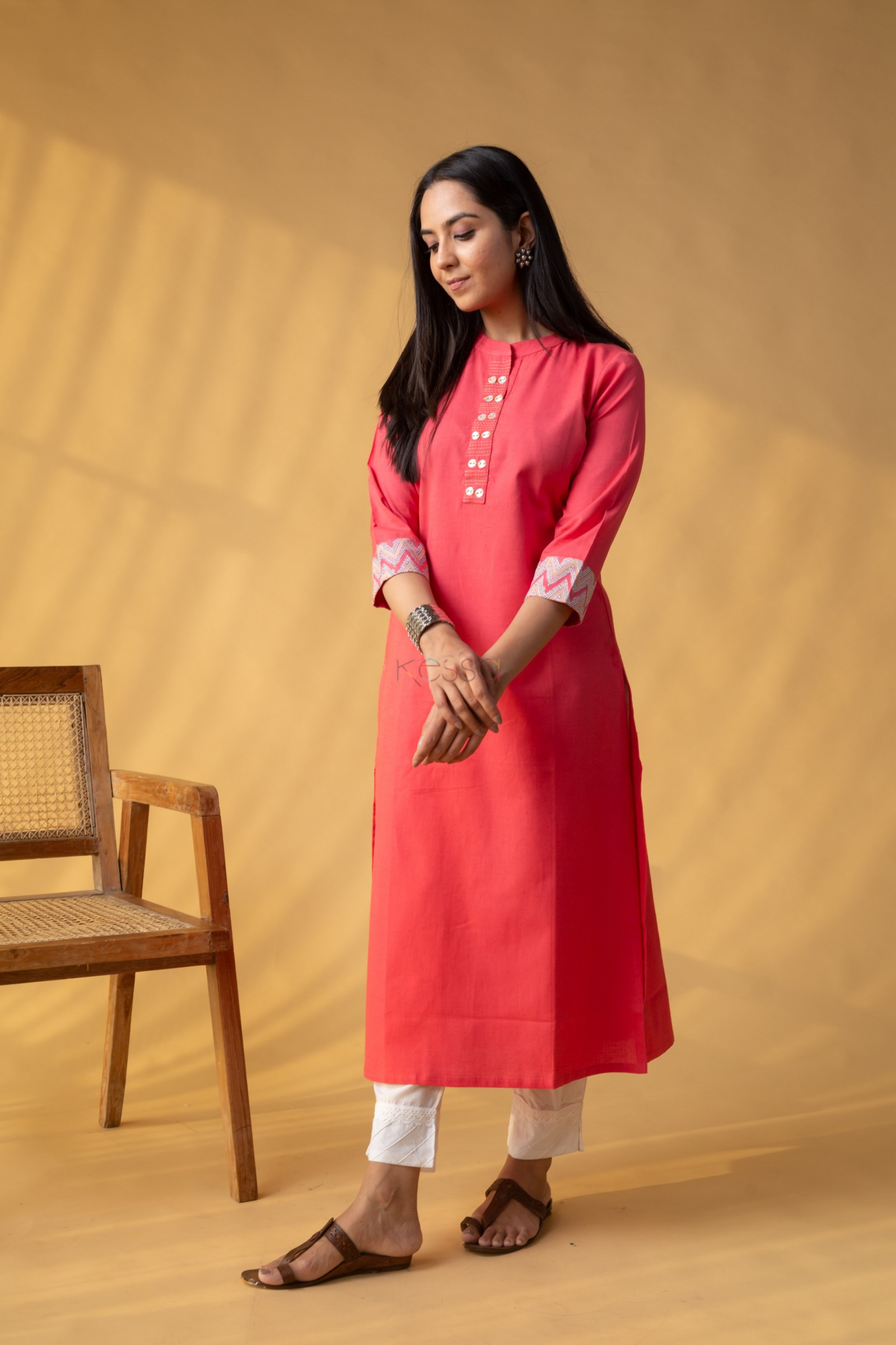 SKU: WS1099 Introducing our chic Cotton Flex Kurta in vibrant Carrot Red, tailored to a flattering straight fit. The neckline is adorned with delicate Katha lines and accented with charming shell buttons for a touch of sophistication. Highlighted border sleeves and a classic collar neckline elevate the design, while 3/4th sleeves and a convenient side pocket add practicality to this timeless piece, perfect for any occasion.Pair it with our muslin cotton printex pants for a cohesive look that exudes confidence.