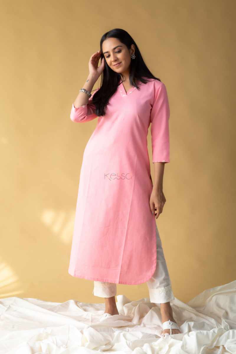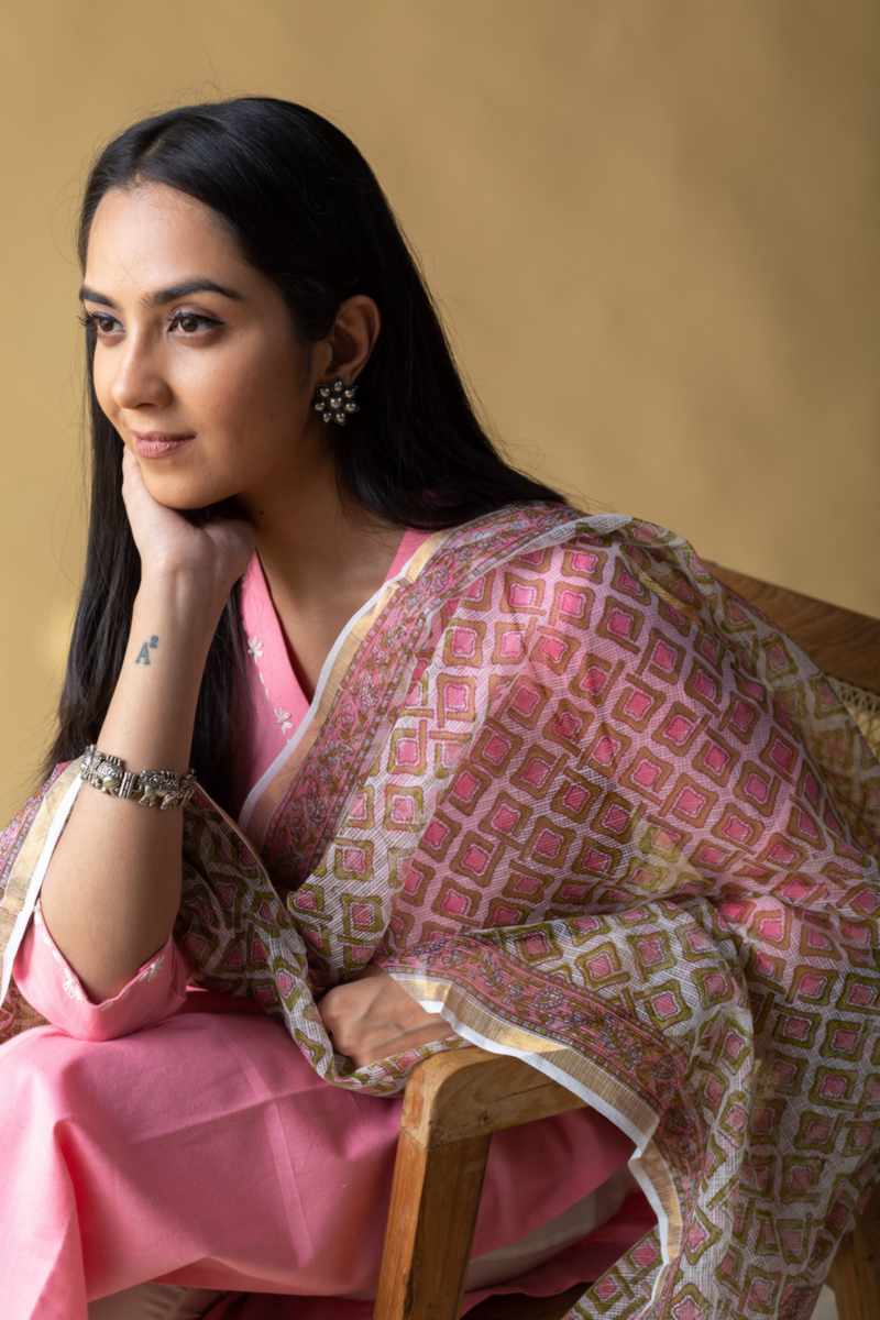 SKU: WS1100 Elevate your ethnic wardrobe with our exquisite Cotton Kurta Dupatta Set. Crafted from breathable Cotton Flex in a serene Baby Pink hue, the kurta is adorned with intricate Katha and Moti work. Paired with a vibrant Cotton Kota Doriya dupatta boasting multi-color tones, and featuring a delicate handblock design, this ensemble exudes grace and elegance. Complete with a V-neckline, 3/4th sleeves, and a convenient side pocket, it’s the epitome of comfort and style for any occasion.Pair it with our muslin cotton printex pants for a cohesive look that exudes confidence.