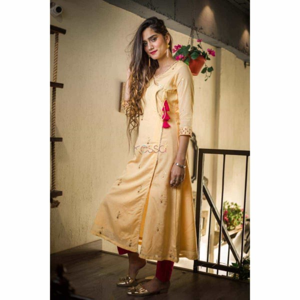 SKU: WS349 This solid beige kurta with front slit is based on cotton silk fabric and is highlighted with pink tassels.