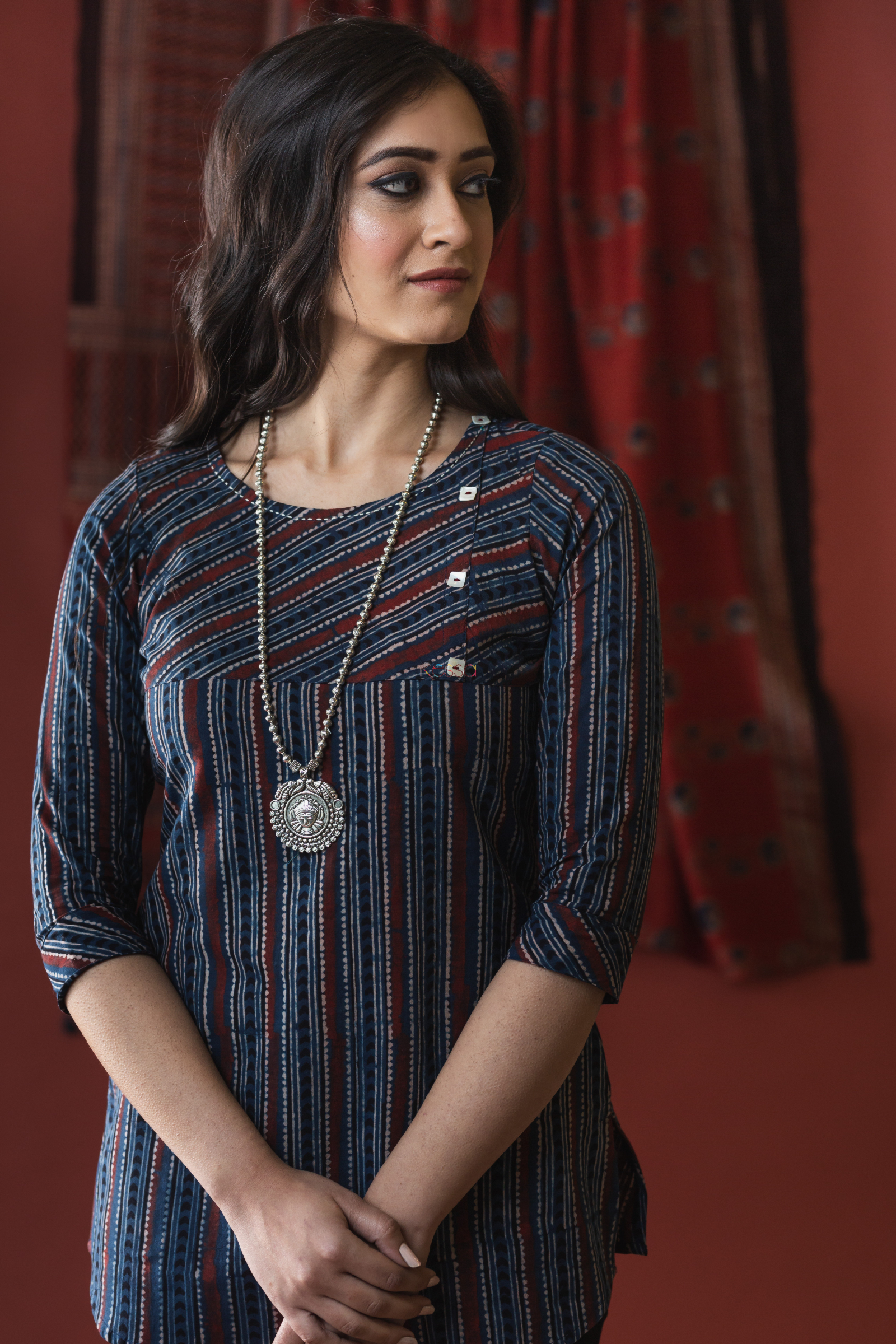 SKU: WS626 Cut in a distinct short straight silhouette, the Miraj blue Short Kurta is carefully block-printed with a dainty jaal pattern in dark tones. A great choice for daily-wear, this soft cotton outfit is embellished with eloquent hand kantha work on neck and side button.