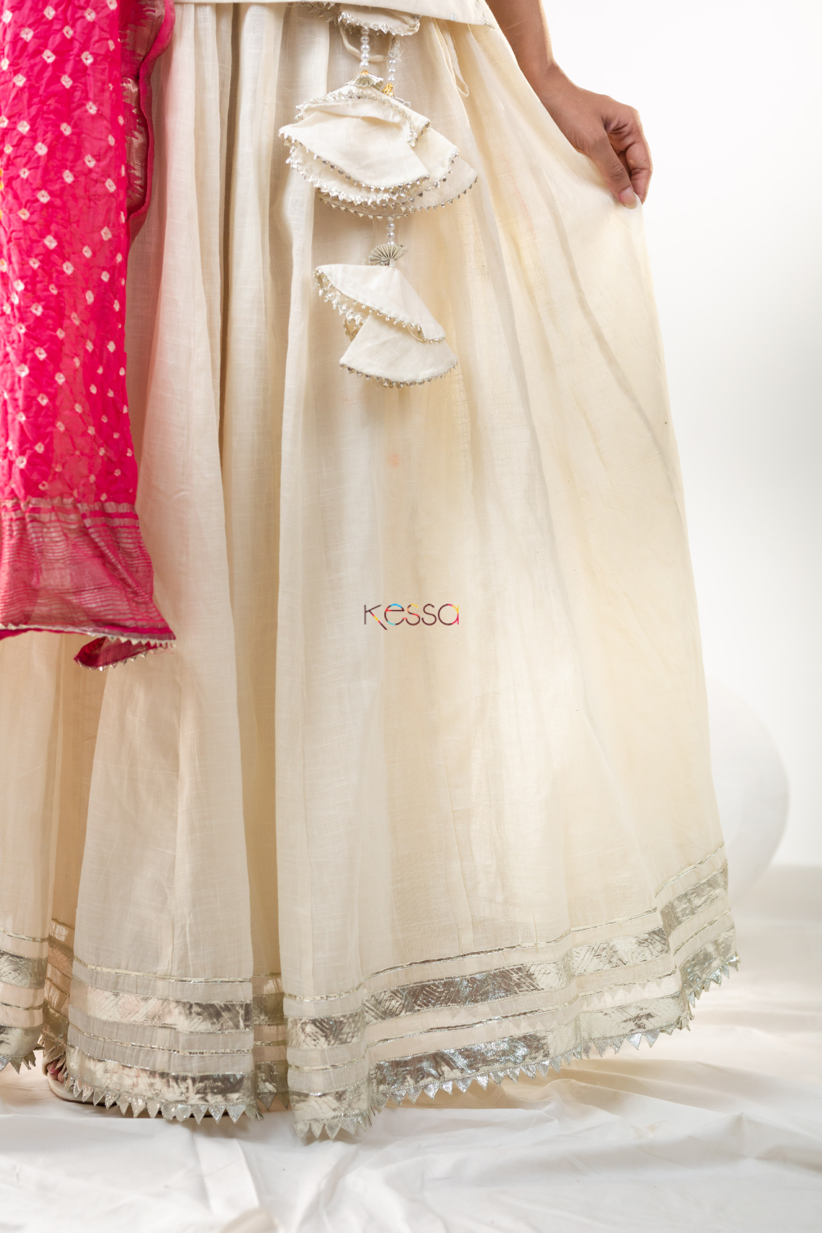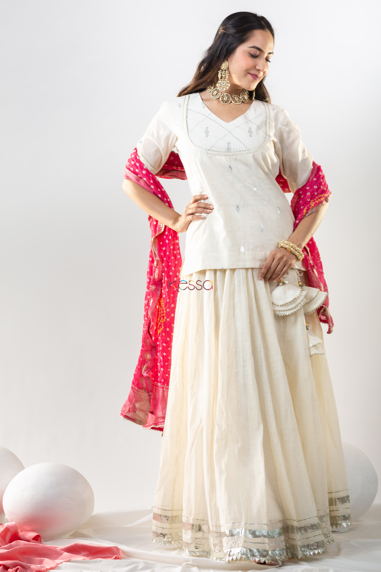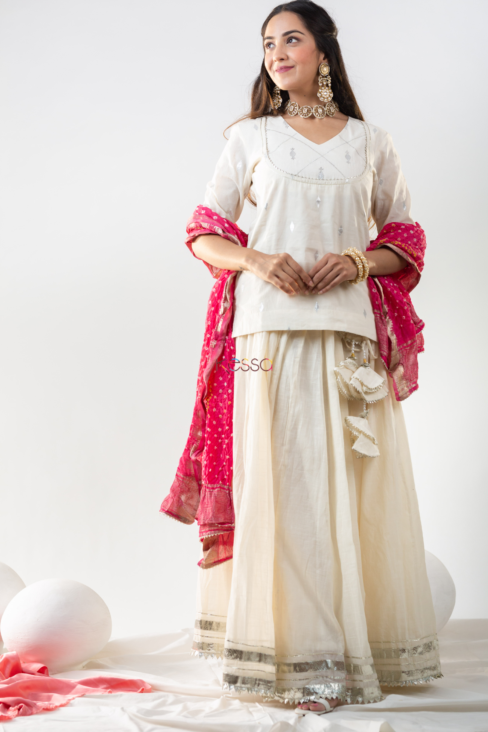 SKU: WS852 Tailored out of 100% premium lurex cotton, niranjana is a vision in serene white. The short, straight kurta shows off the voluminous beauty of the flared skirt. The cream is further brightened with exquisite lurex silver shining butti print.. The elongating round neckline and half sleeves are further highlighted with gotta work on neck and sleeves. While the tassel at the back adds a quirky touch to the exquisite outfit. The set is complete with a contrasting pink bandani dupatta and a full flared mulmul skirt.