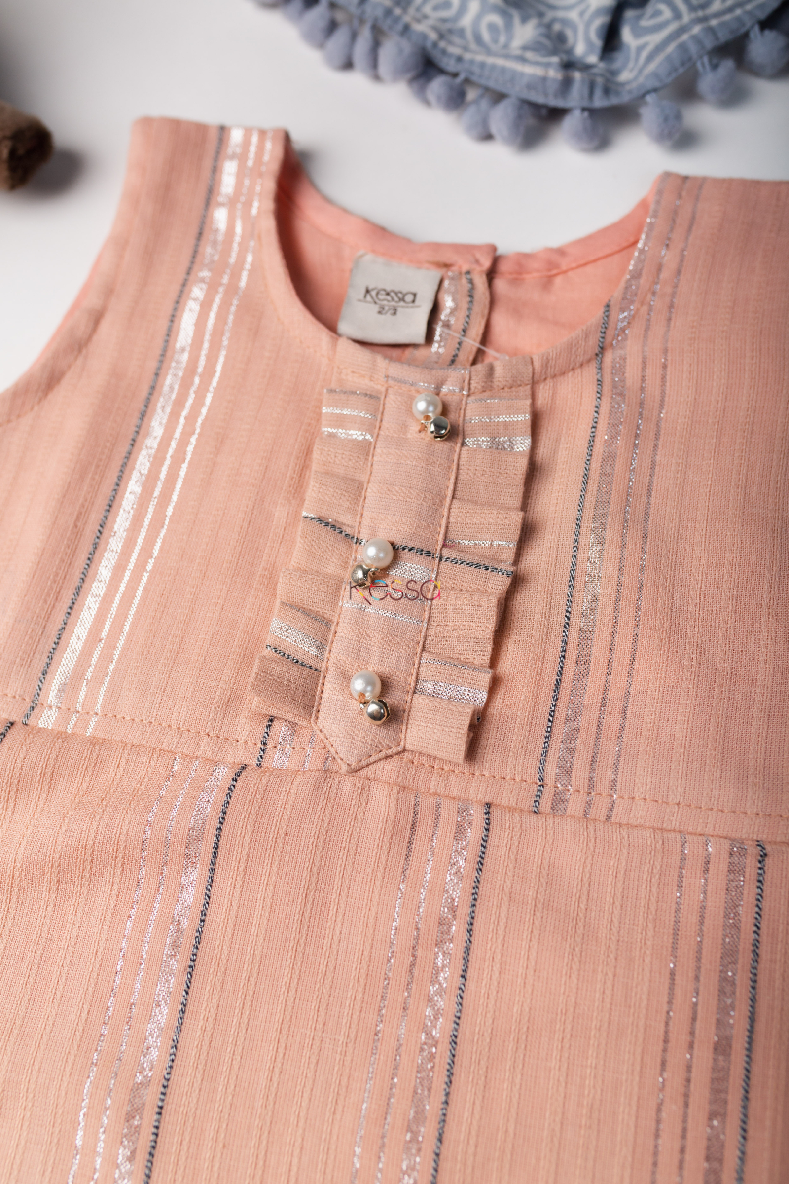 SKU: WSK45 Dayamurith is made out of 100% premium cotton to suit best for the delicate skin of your little angel. And, keep her comfortable all day long. The prisitine peach of the dress is adorned with an overlay of vivid stripes. The sleeveless dress features a super-cute side frills on the yoke and lower and comes with front buttons.