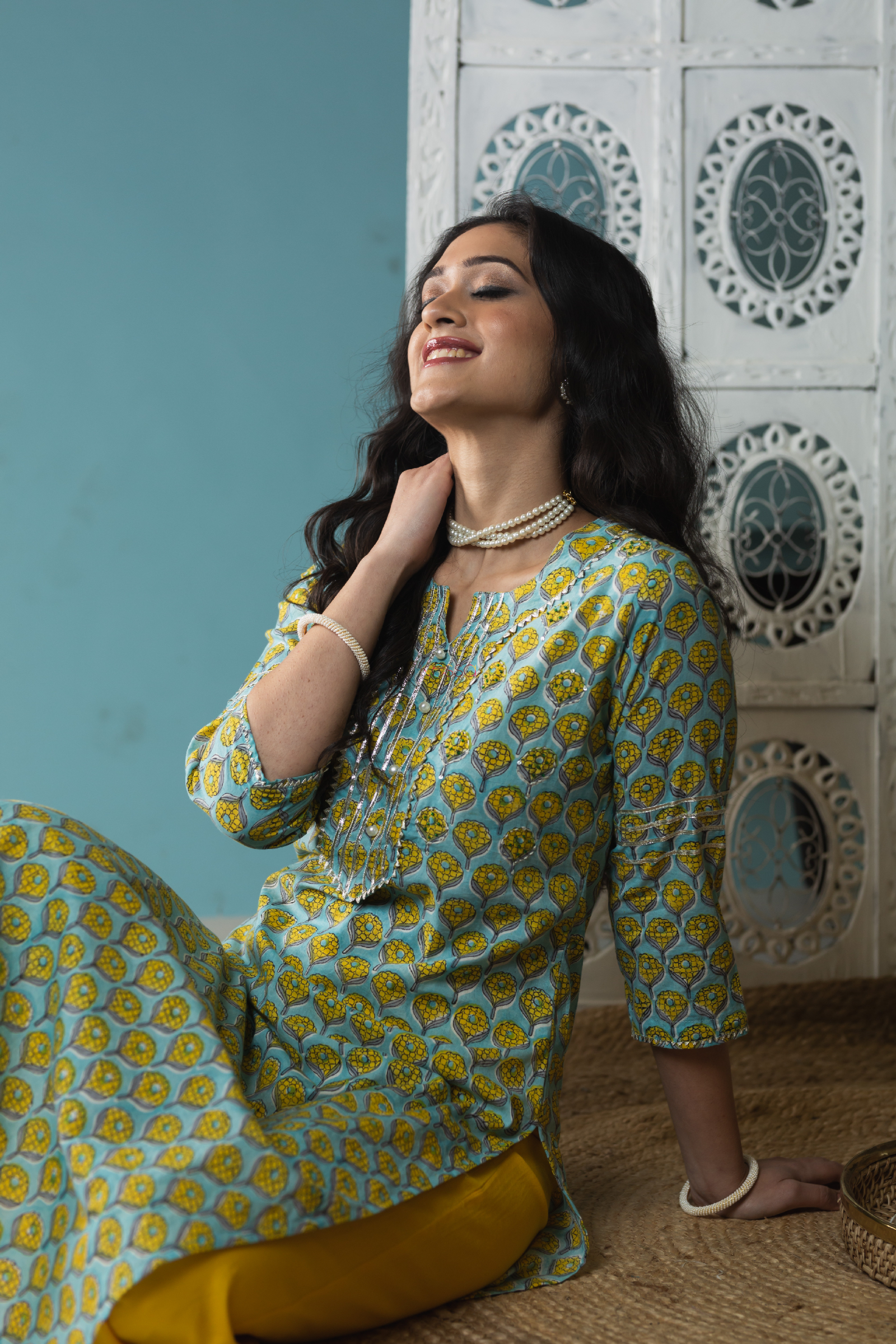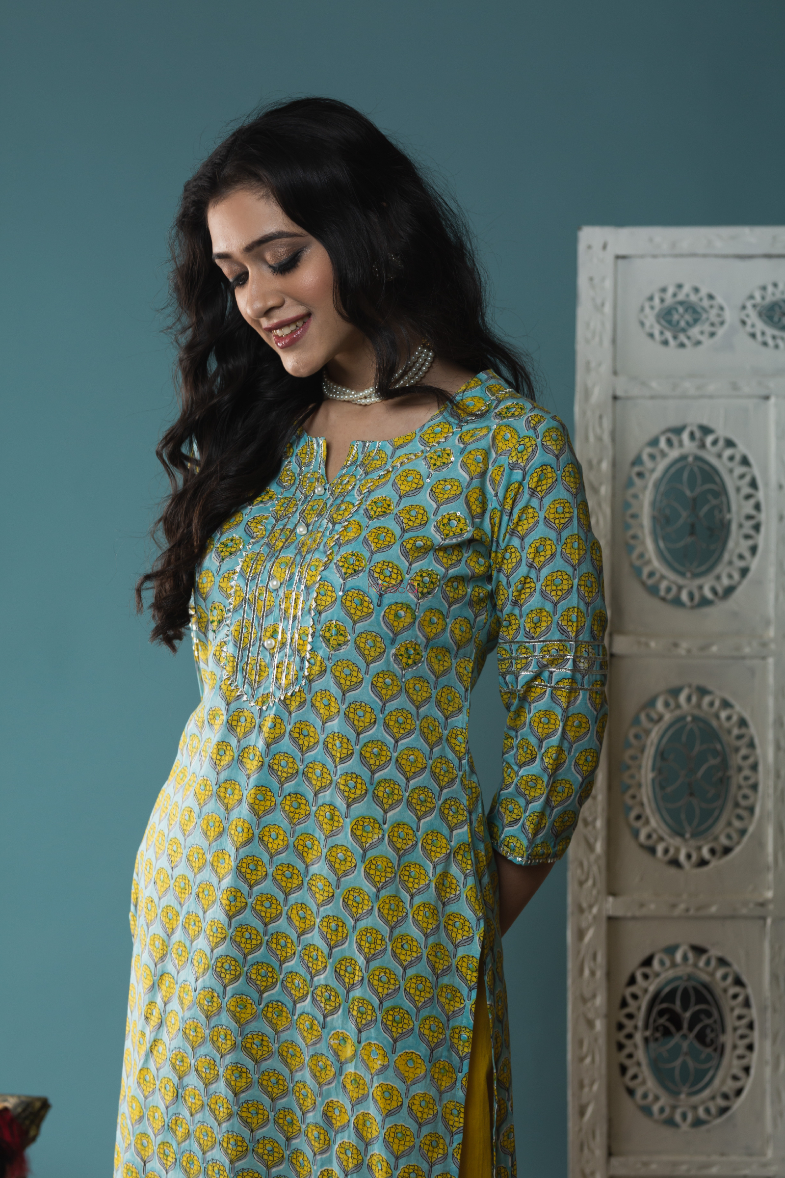 SKU: WSR141 The Kurta is graced with a gorgeous turquoise blue hand block-printed pattern. Woven in soothing Cotton fabric, this straight cut Kurta comes laden with Gota detailing. Hand-embroidered sequins work all over lends it a festive touch. It goes perfectly with the yellow palazzo.