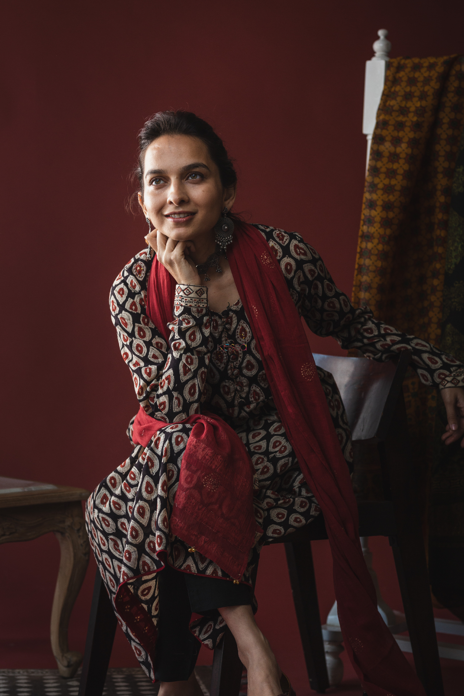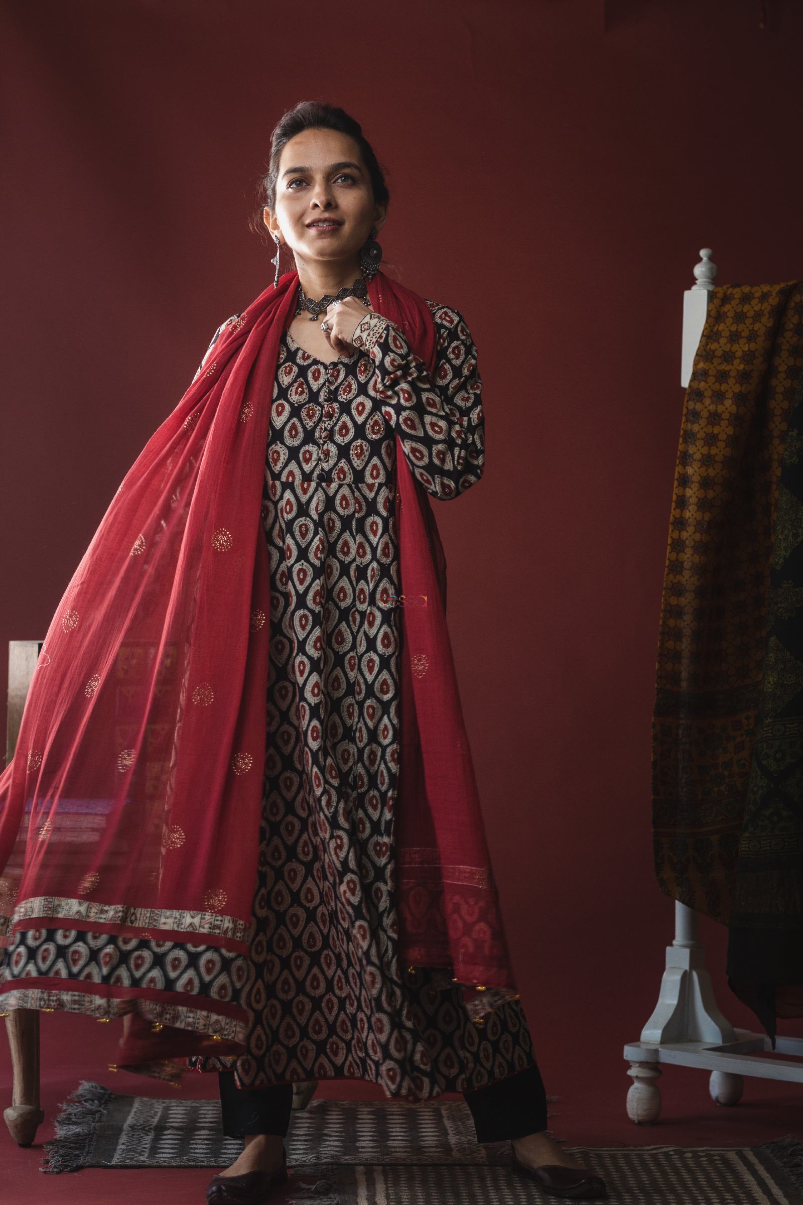 SKU: WSR152 Handcrafted in an A-line silhouette, this kalidaar Kurta comes block-printed with a gorgeous buti pattern. In terms of hand-embroidery, this cotton kurta features fluent thread work on the yoke. The kurta comes with chudidaar sleeves and with mull cotton dupatta. The dupatta comes with khadi butti and fabric borders. Its best suitable with our black or maroon pants