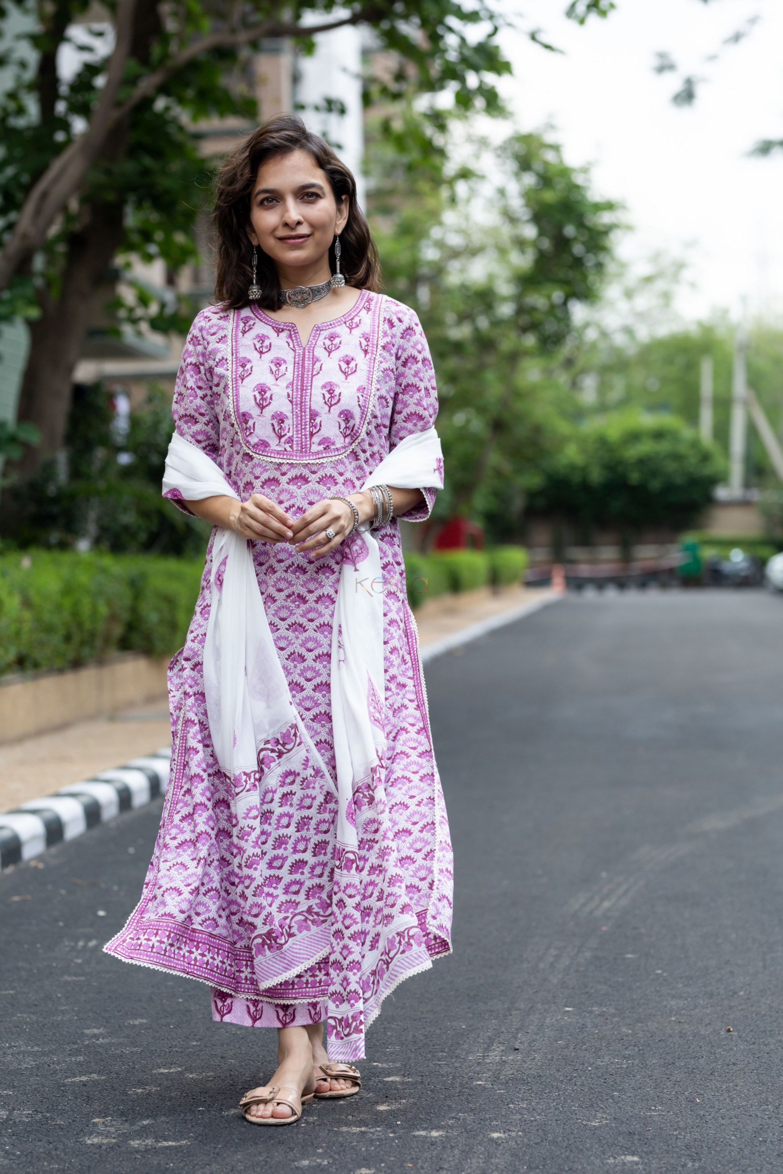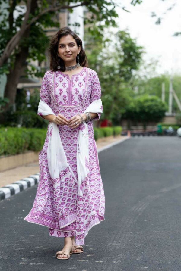 SKU: WSR393 The cotton complete suit set in lavender and white color is a beautifully designed ensemble featuring handblock print. The set includes an A-line kurta with a side slit, accentuated by a kurta-yoke highlighted with a border, sequence, and croshia lace. The sleeves and panel of the kurta are also highlighted with sleeves and border details, adding to its elegant charm. The accompanying dupatta is adorned with croshia lace, enhancing its overall appeal. The kurta has a round neckline with a V-cut, and the 3/4th sleeves add a touch of grace. Both the kurta and bottom come with side pockets, providing functionality along with style. This cotton suit set is perfect for those seeking a blend of comfort, sophistication, and intricate detailing in their attire.