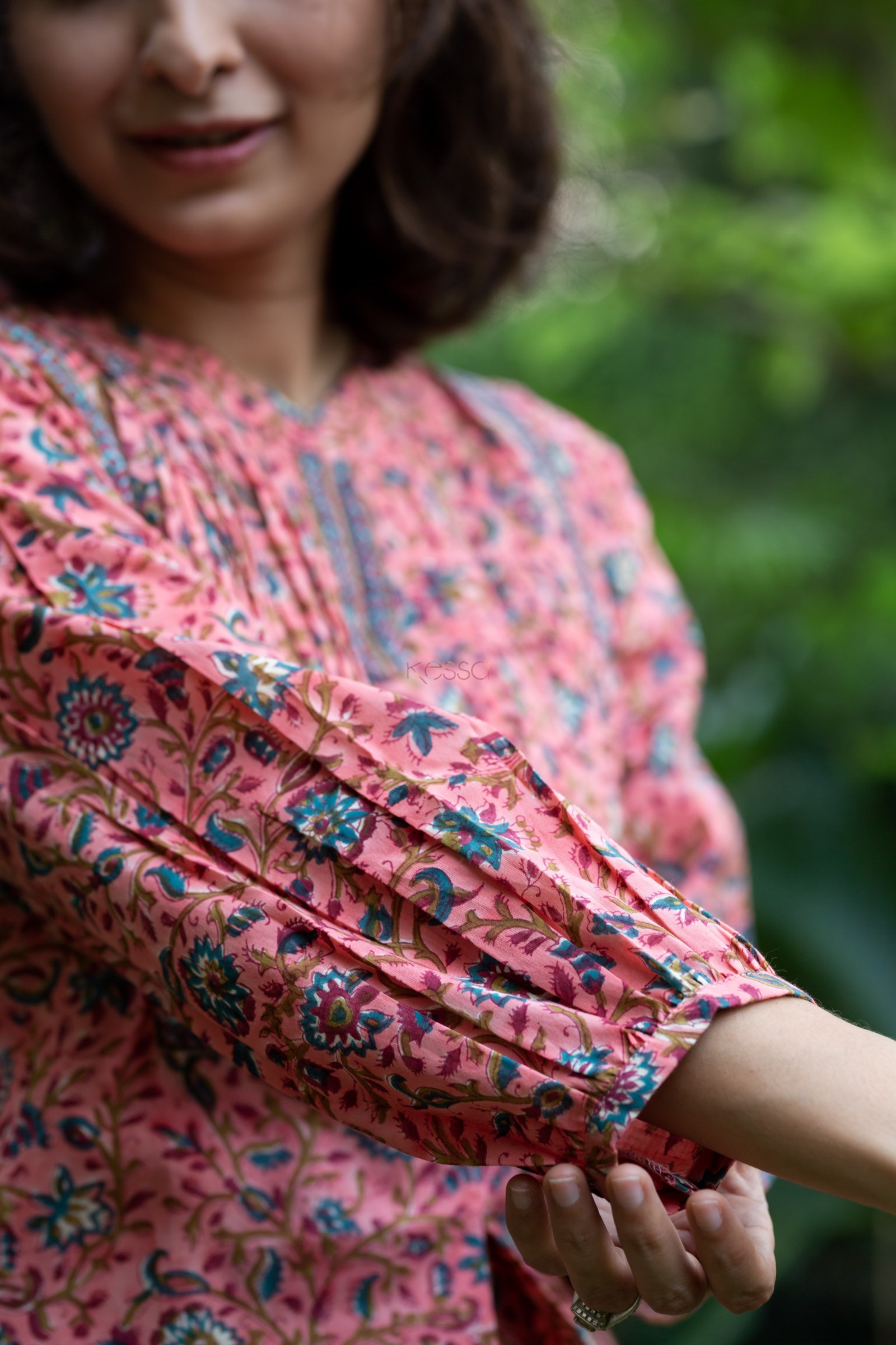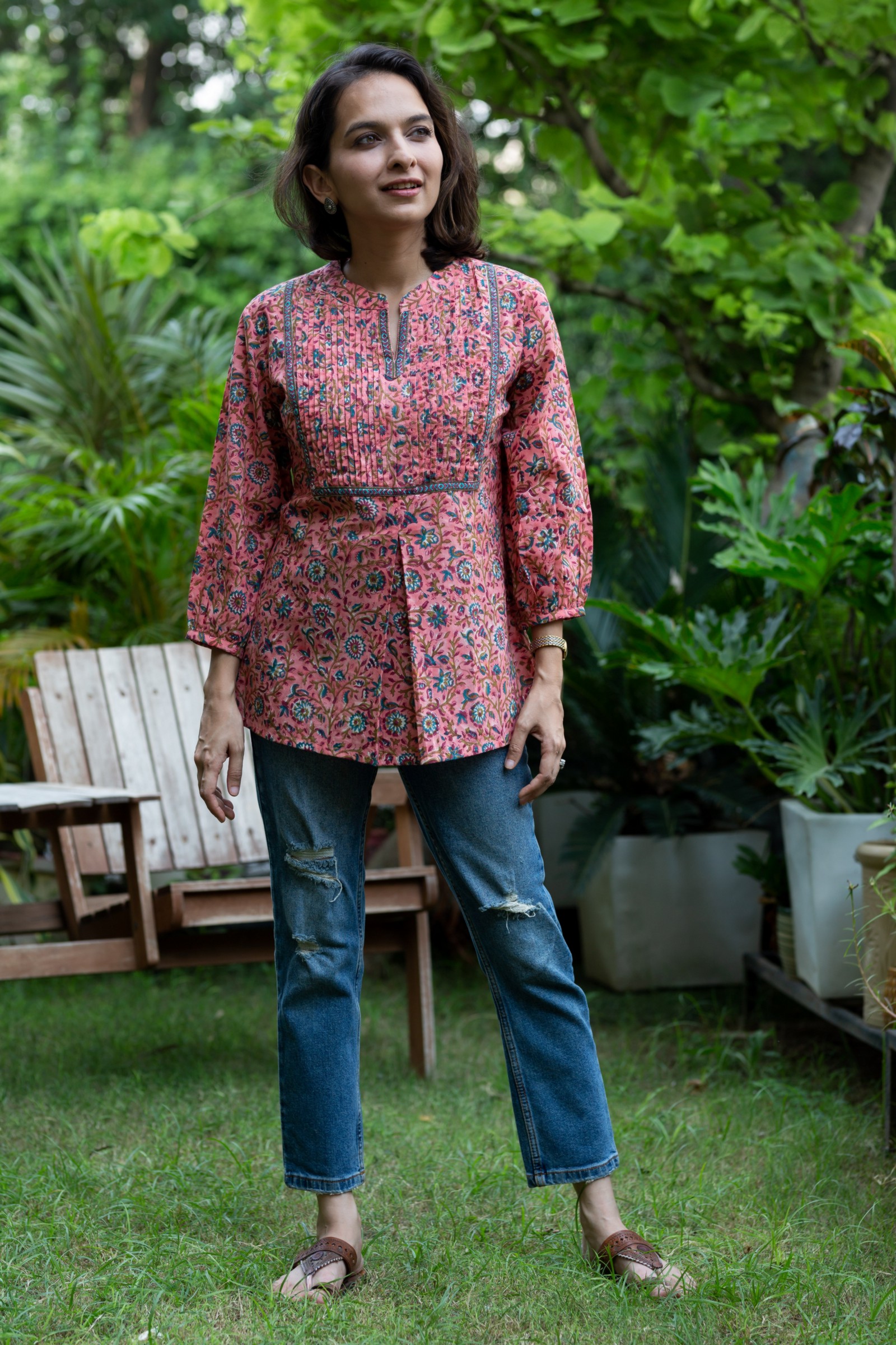 SKU: WSR400 Elevate your summer style with our exquisite peach cotton short top featuring a delicate jaal print, reminiscent of traditional craftsmanship. The Yoke is adorned with intricate Printex patterns, gracefully framing the neckline and border, while the elegant collar with a flattering V-neck adds a touch of sophistication. With its 3/4th sleeves, this top strikes the perfect balance between comfort and chic, making it a versatile addition to your wardrobe.