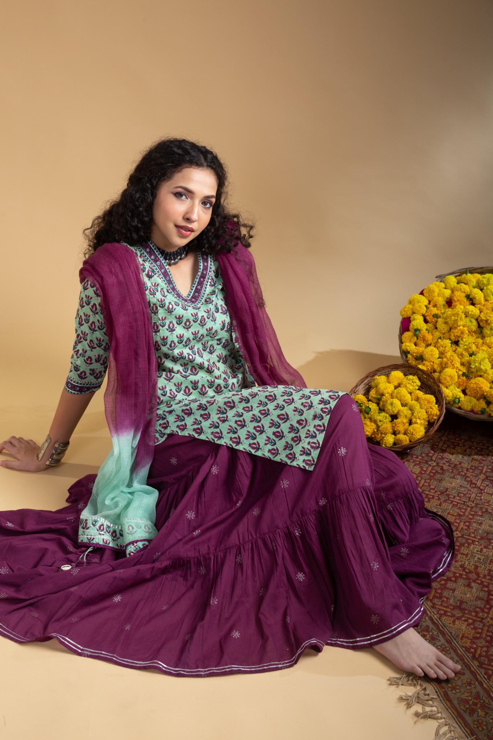 SKU: WSR424 Elevate your ethnic style with this exquisite Cotton Complete Skirt Set. The set includes a charming pista green kurta adorned with floral patterns, featuring a yoke highlighted with mirror and sequence work. The wine-colored skirt is beautifully highlighted with gota and silver khadi print, complemented by side thread tassels. The accompanying Kota Doriya dupatta in pista green with wine accents is adorned with a side border, gota, and croshia lace, adding a touch of elegance. With a V-neck, 3/4th sleeves, and both side pockets, this ensemble is perfect for any special occasion.