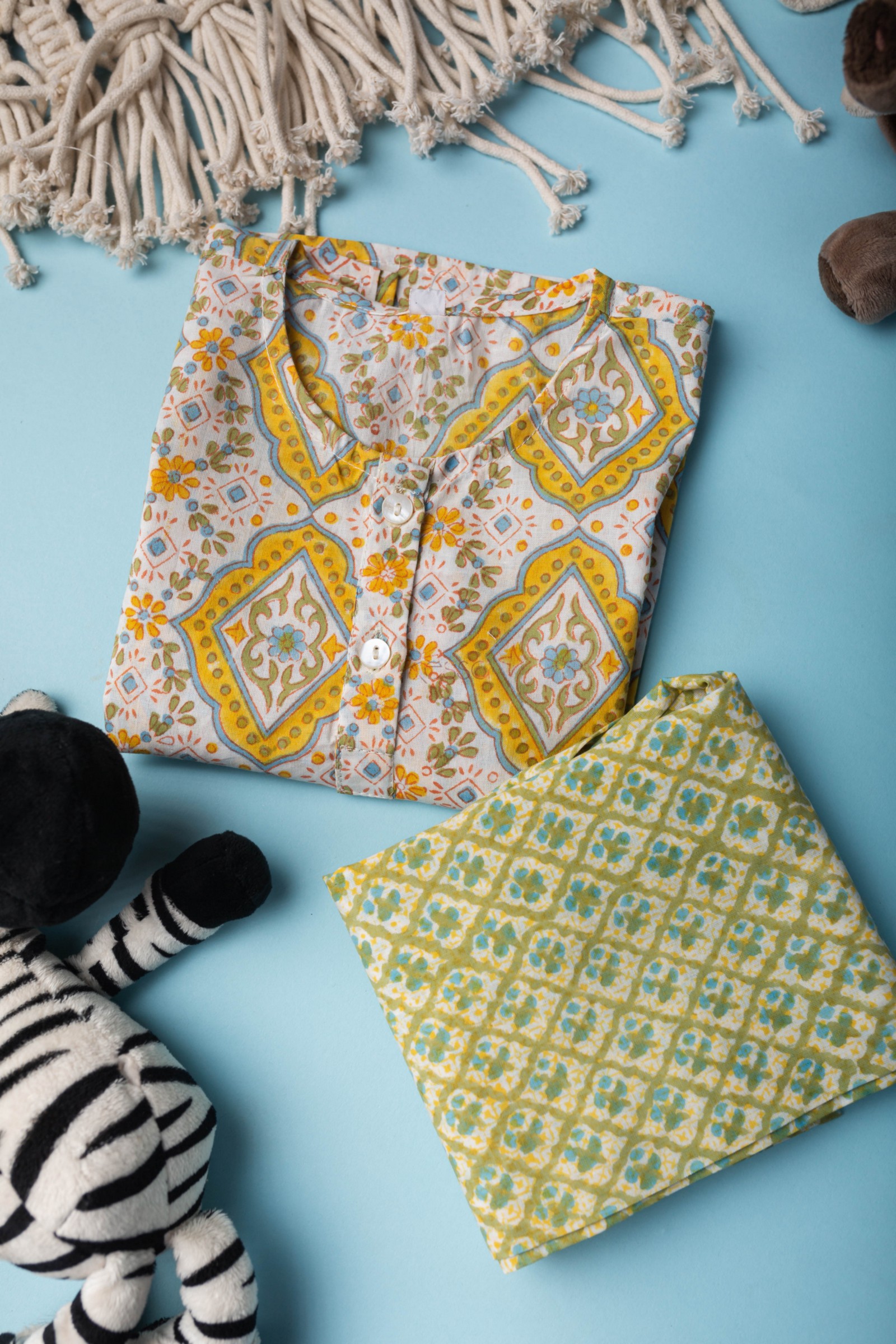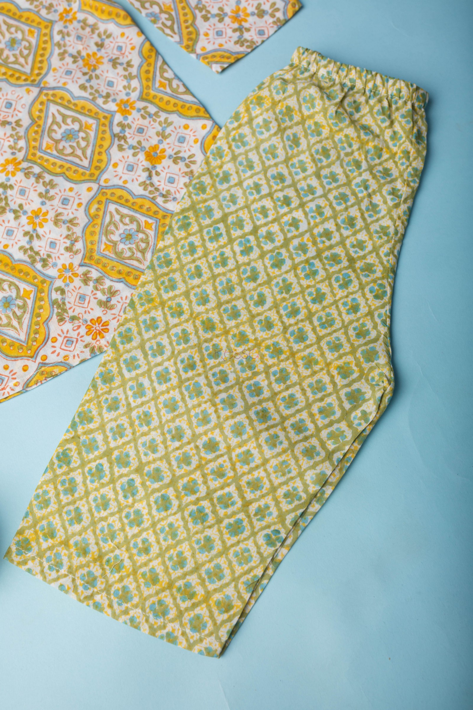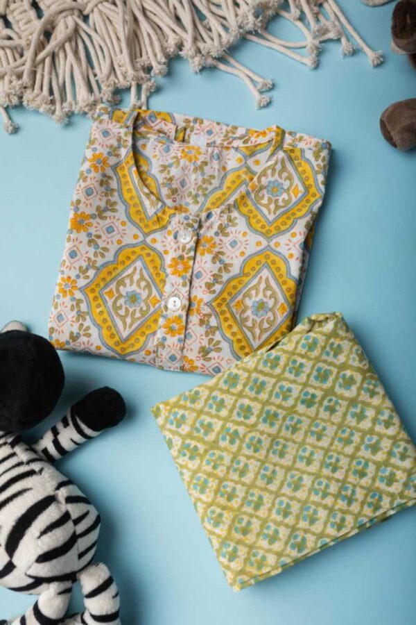 SKU: WSRK101 A cotton kurtapyjama set is a traditional outfit from India. This particular set is made from soft cotton fabric that is comfortable to wear. The fabric has been printed by handblock printing, which creates a beautiful floral pattern in multiple colors. The kurta has a round neck and full sleeves, making it perfect for cooler weather. It’s a great outfit for kids to wear on special occasions or just for everyday comfort!