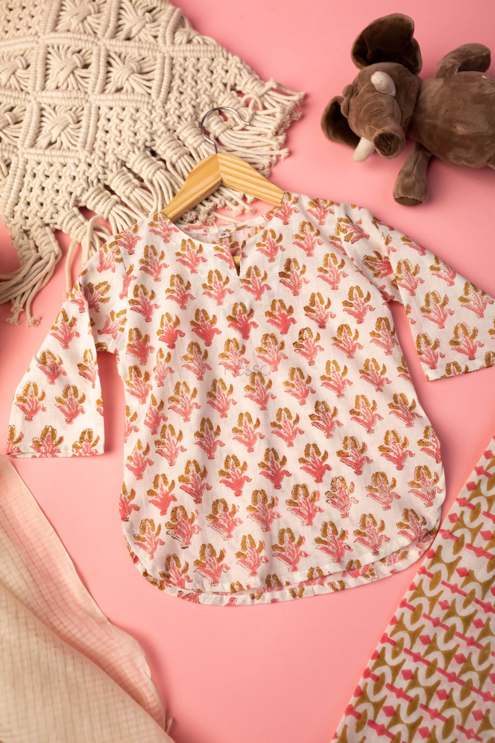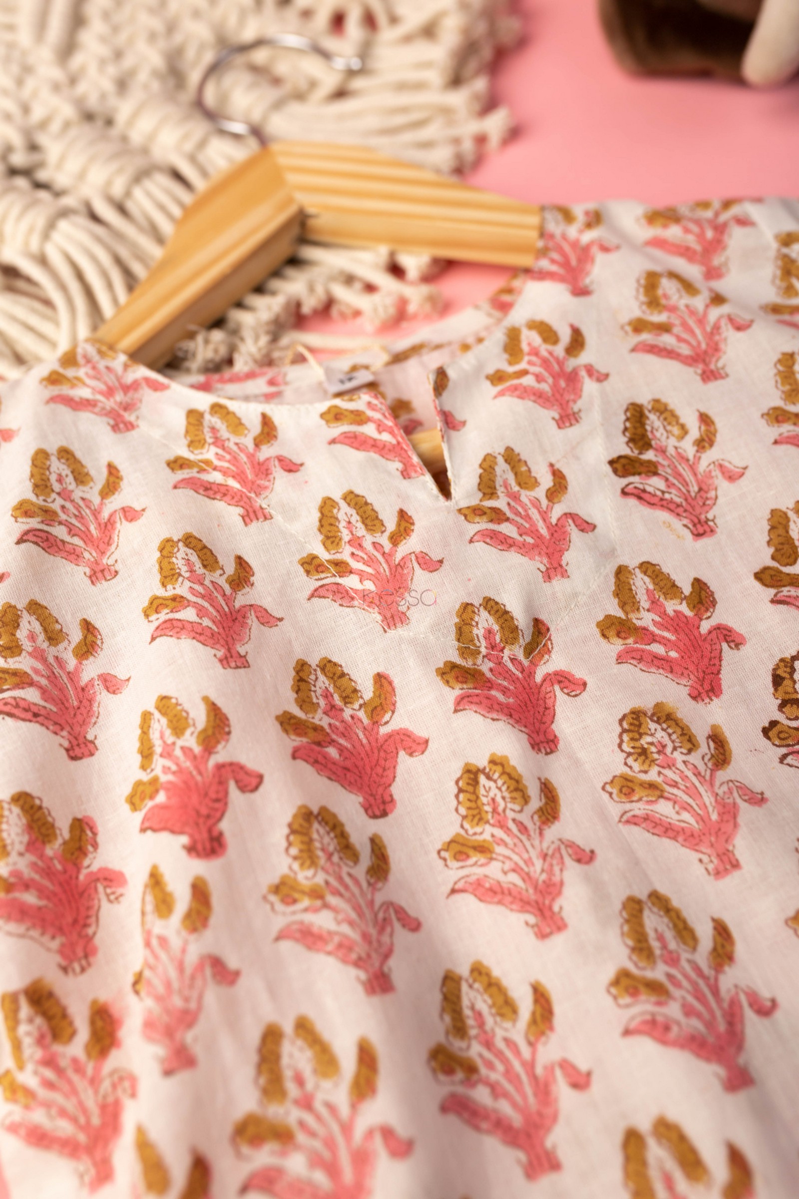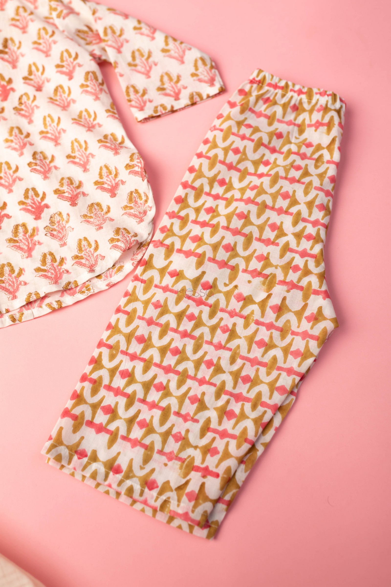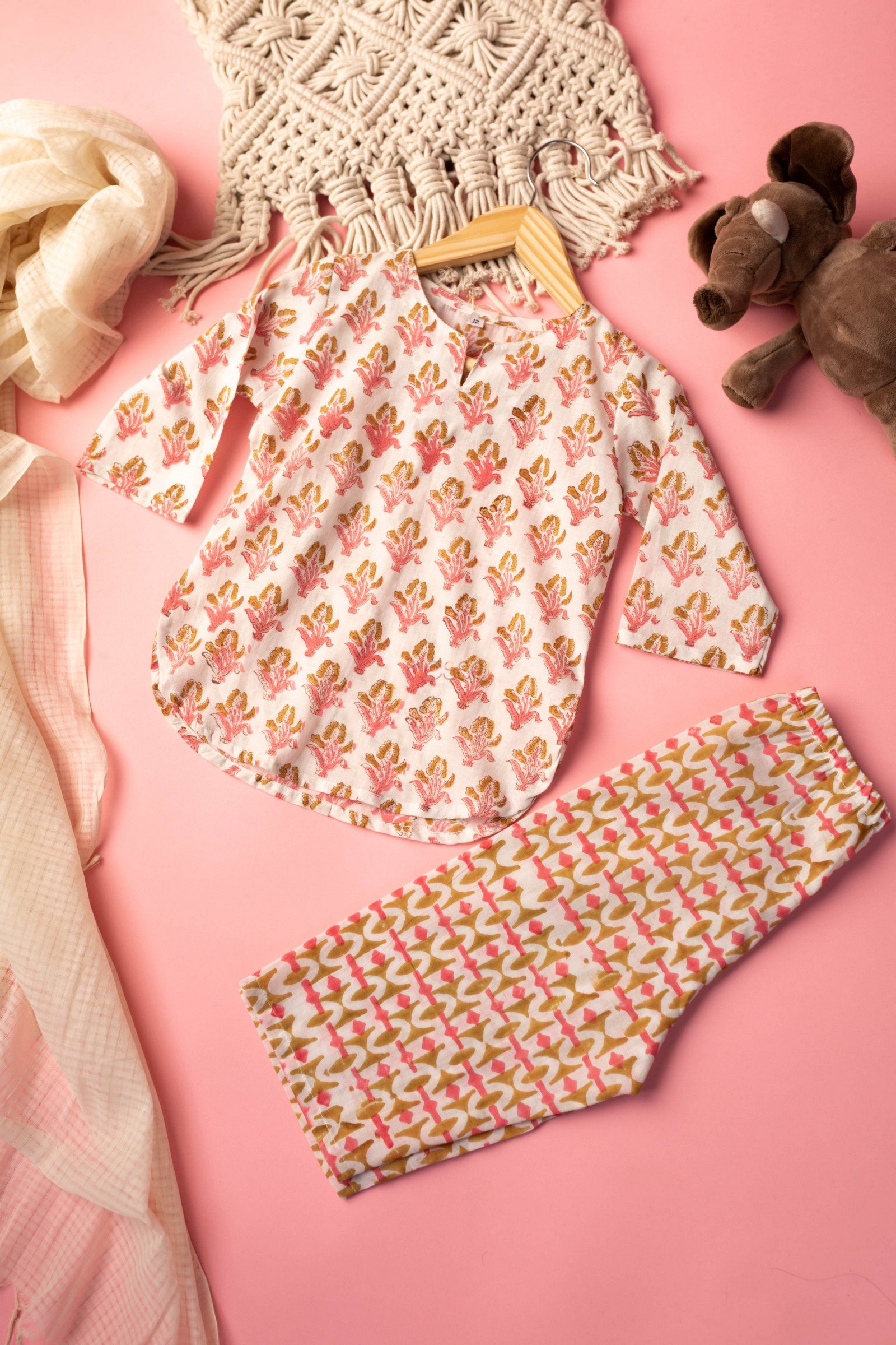 SKU: WSRK73 A cotton kurtapyjama set is a traditional outfit from India. This particular set is made from soft cotton fabric that is comfortable to wear. The fabric has been printed by handblock printing, which creates a beautiful floral pattern in multiple colors. The kurta has a round neck and full sleeves, making it perfect for cooler weather. It’s a great outfit for kids to wear on special occasions or just for everyday comfort!