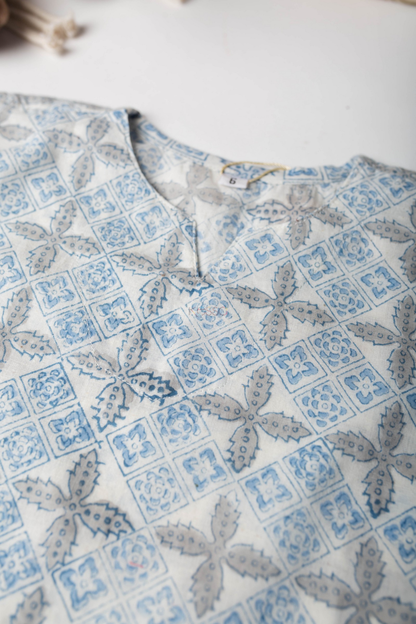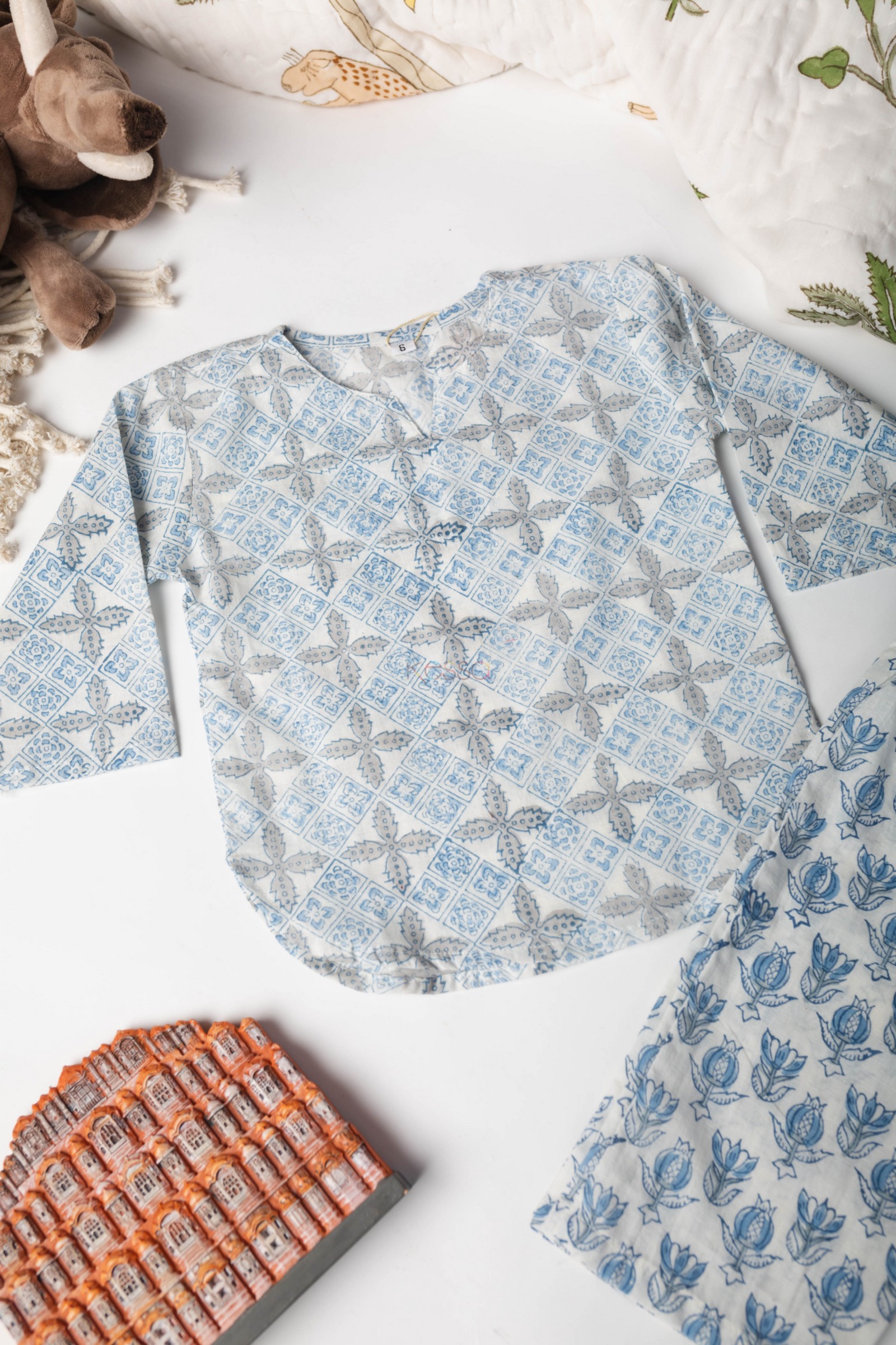 SKU: WSRK89 The cotton kurta pyjama set is a traditional Indian outfit for children made from comfortable cotton fabric. This particular set features a handblock print design with a round neck and v-cut detailing, full sleeves, and a white base with pink booti. The multi-color print adds a playful touch to the classic design, making it perfect for special occasions or everyday wear.