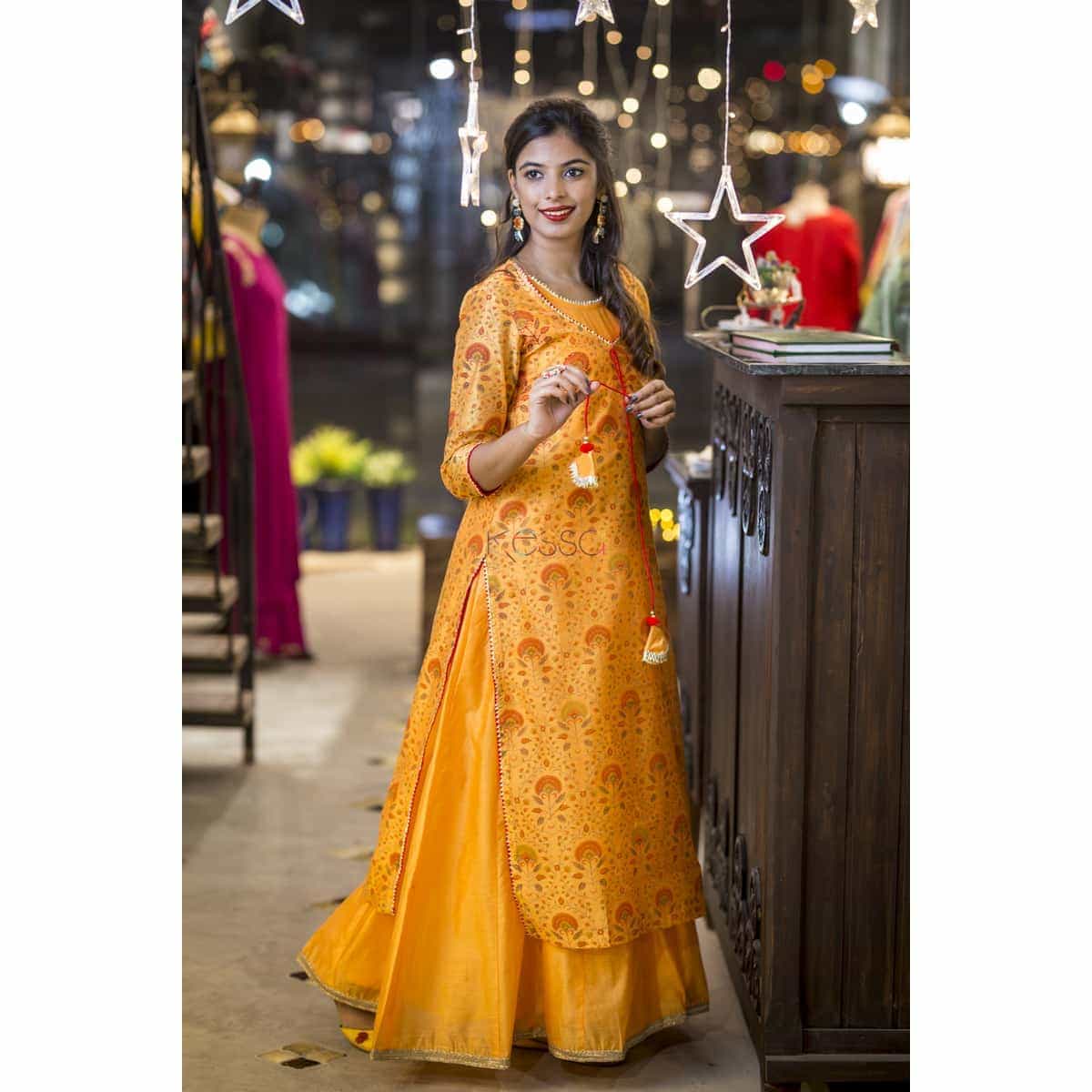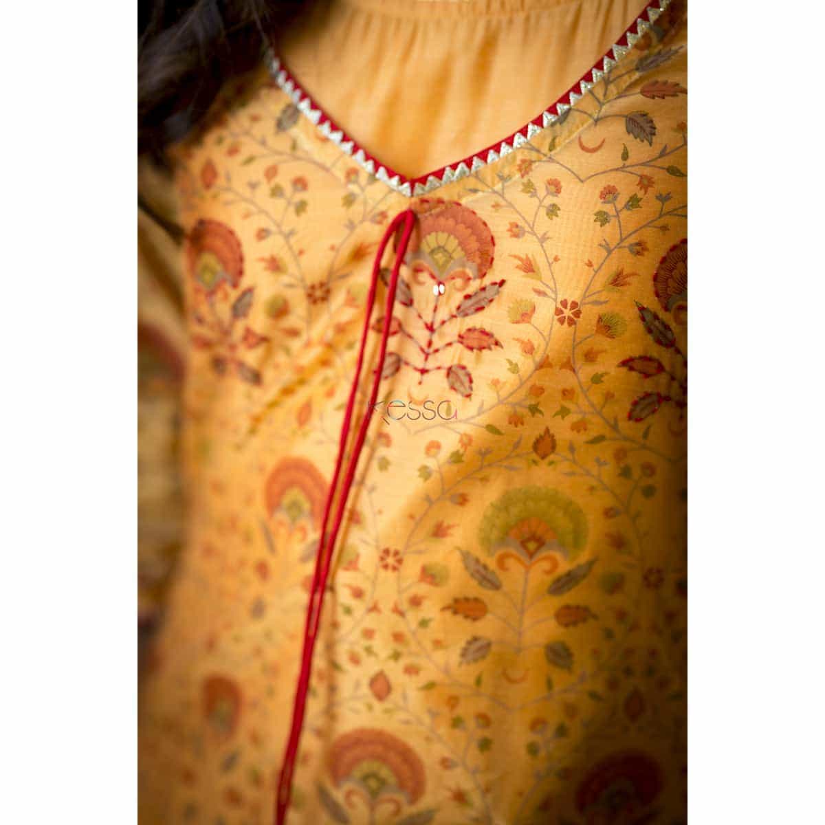 SKU: NE06 Kusvaa brings you a gorgeous block-print double-layered dress with front tassels based on chanderi fabric. Its border is highlighted with Gota work. This is a two piece dress with a chanderi based sleeveless inner of 55″ length with attached cotton lining and an outer layer of 48″ length.